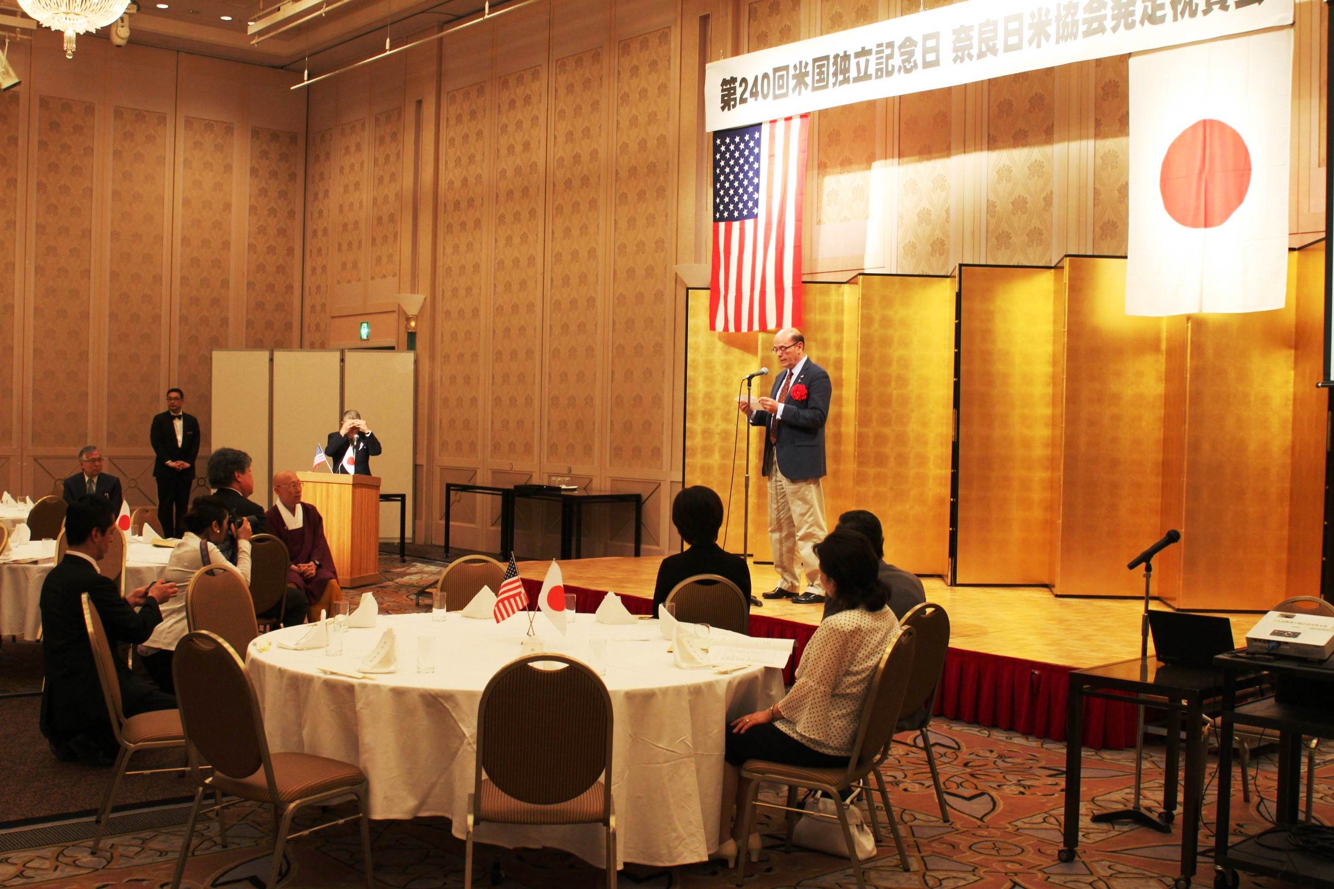 日米親善や障害者支援を推進する県日米協会の発足と、米国の独立記念日を祝う祝賀会が奈良市のホテル日航奈良で開かれ、荒井正吾知事やアレン・グリーンバーグ米総領事ら約100人が出席した。
