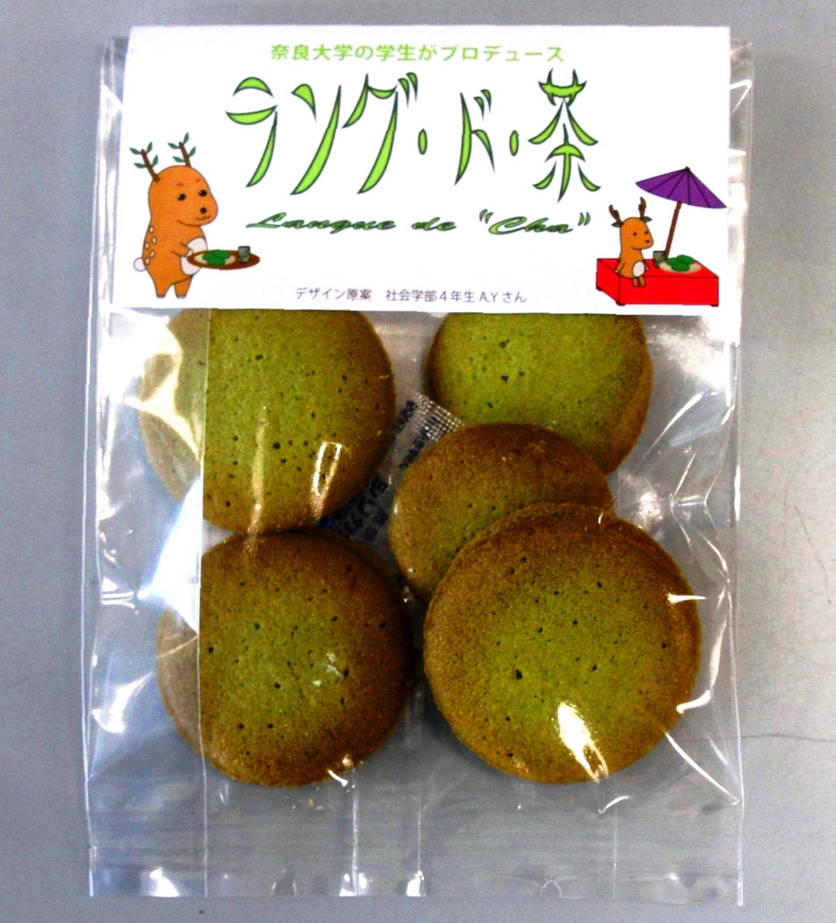 奈良大では尾上正人教授(社会学)を中心に平成24年から県特産物を使ったお菓子の商品化を学生主体で取り組んでおり、ラング・ド・茶は4商品目。薄焼きの堅いクッキーに大和茶を練り込んだお菓子で、山添村産の大和茶が使われており、食べるとお茶特有の香りと苦みが広がる。
