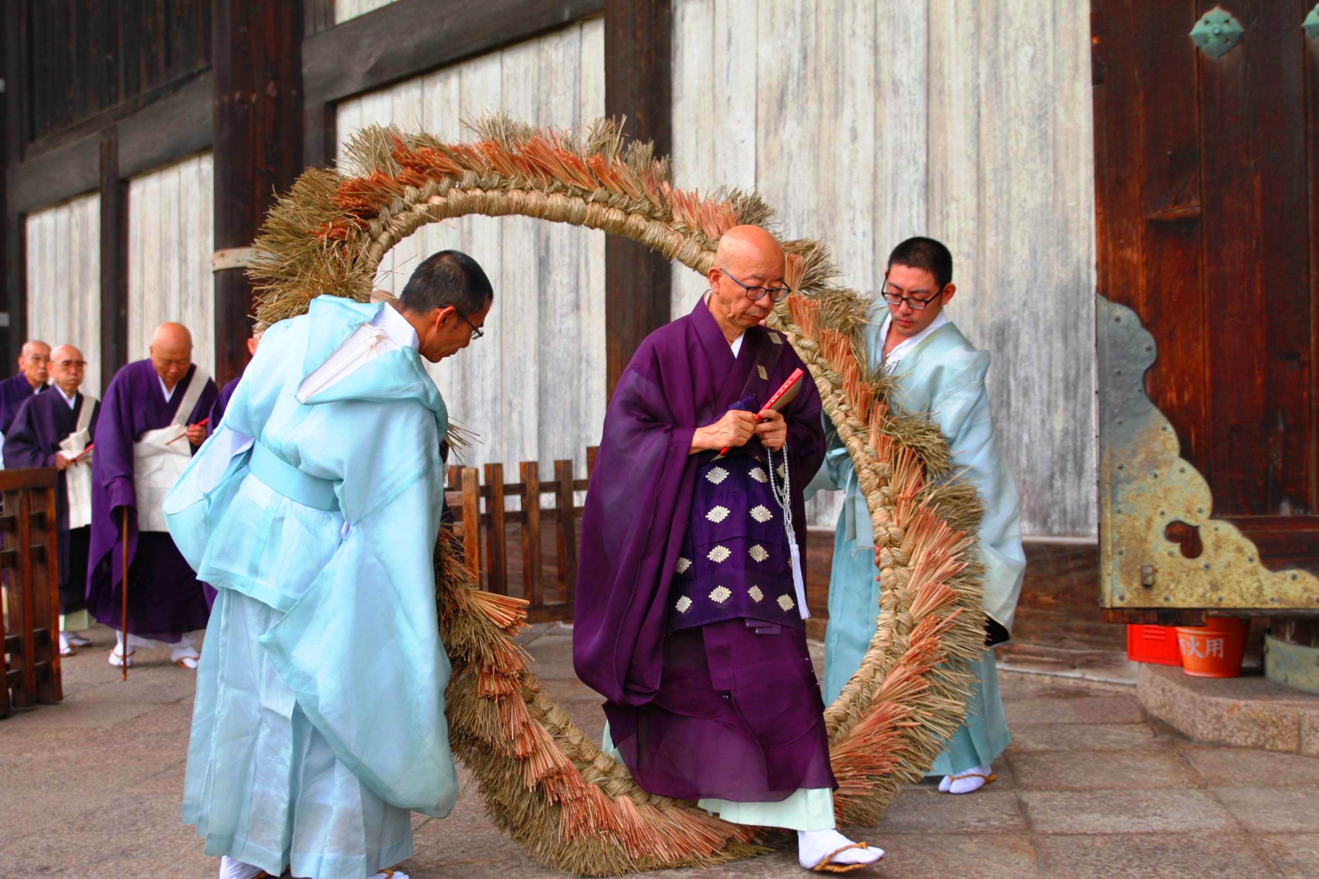 奈良市の東大寺で、夏の無病息災を願う「解除会(けじょえ)」が営まれ、大仏殿に設置された直径約2メートルの茅の輪を参拝者らがくぐり、健康に夏を乗り切れるよう祈りをこめた。