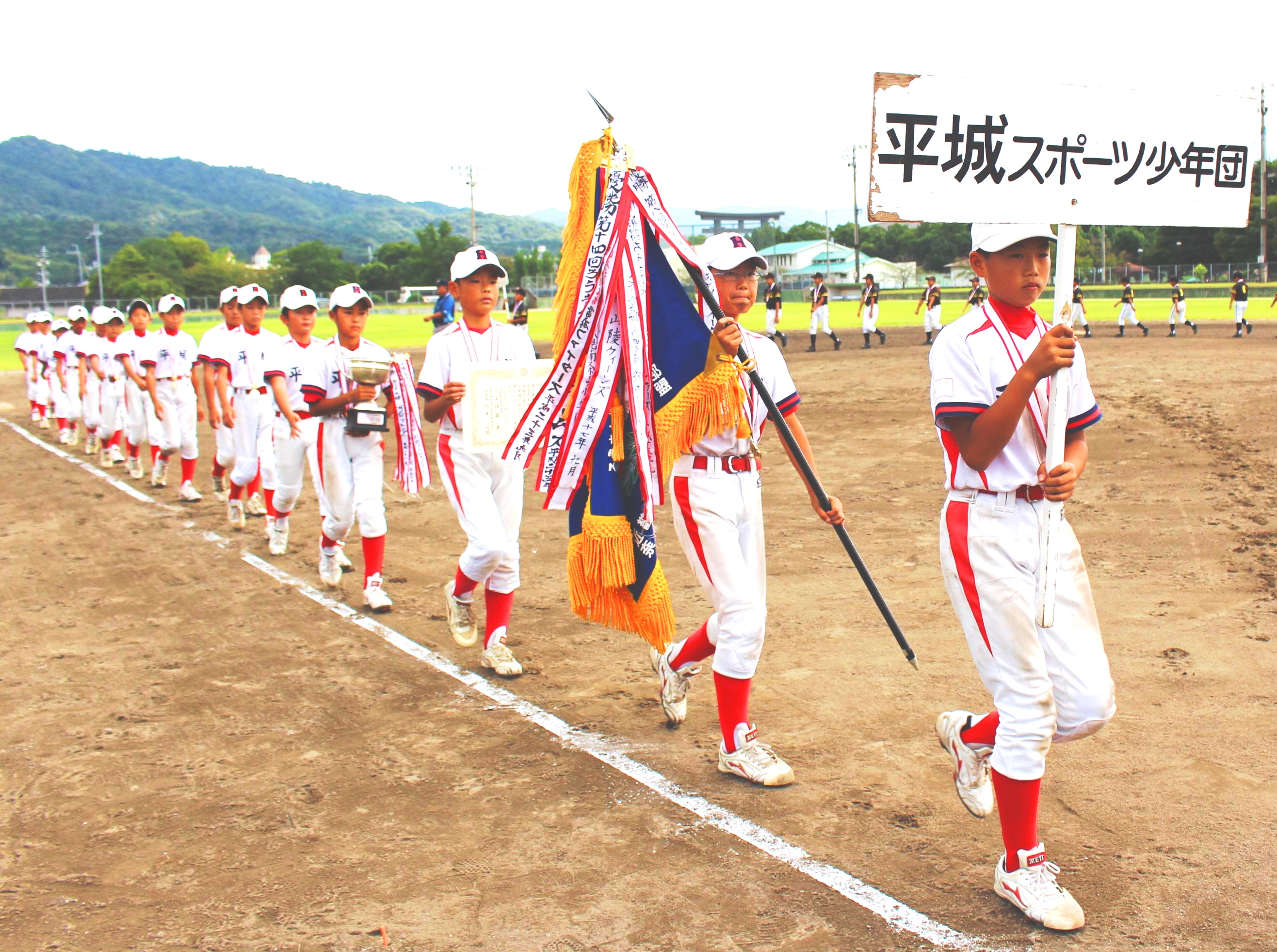 決勝戦は、両チームの投手陣が相手に得点を許さず、延長にもつれ込む白熱した試合展開。平城スポーツ少年団は十回、1死三塁の好機に2番森本が内野安打を放ち、走者が生還、劇的なサヨナラ勝ちで初優勝を決めた。