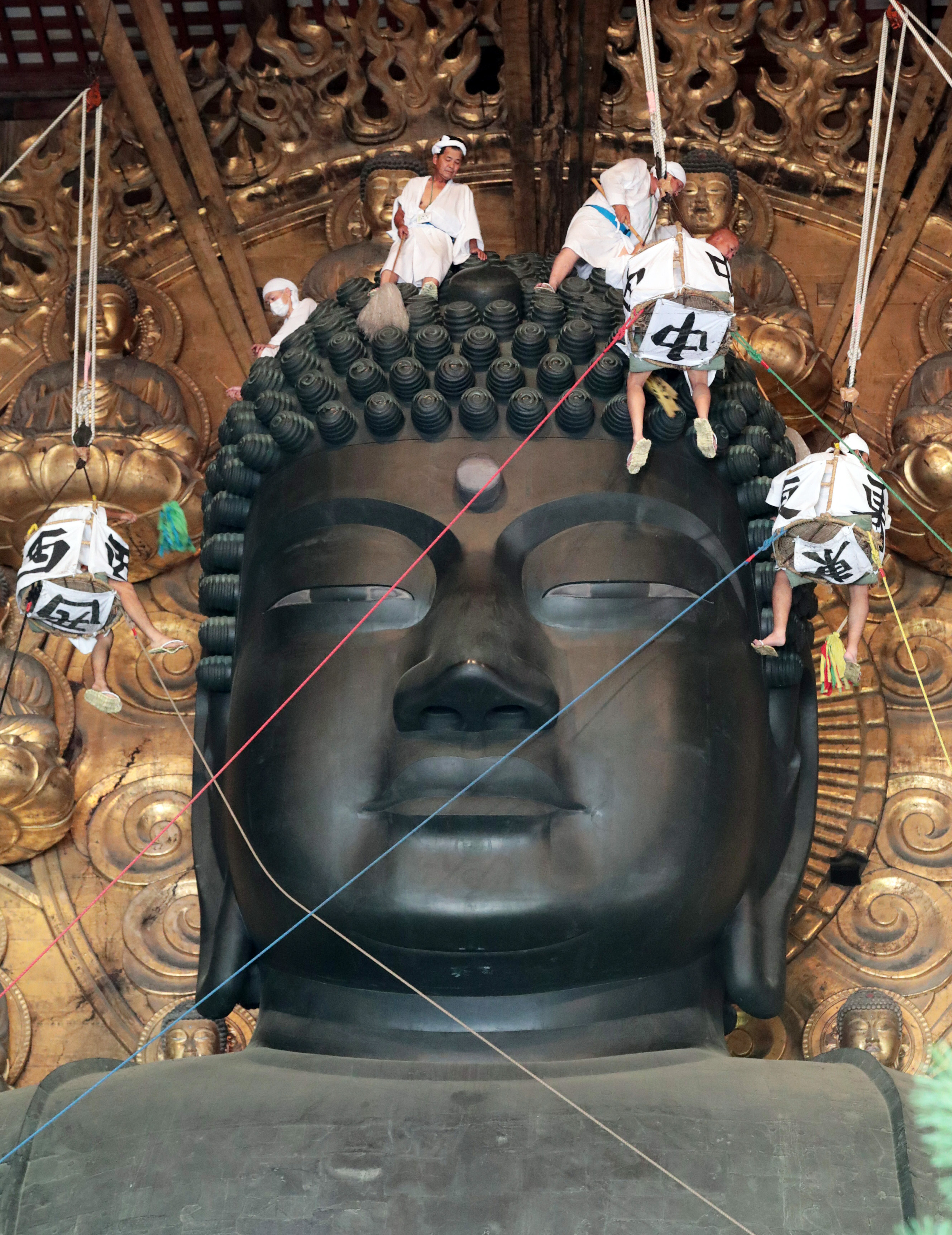 東大寺大仏殿(奈良市)で7日、「奈良の大仏」として知られる本尊・盧舎那仏坐像(国宝)の1年のほこりをはらい清める「お身拭い」が行われ、白装束の僧侶や関係者ら約180人が丁寧にほこりを落とした。