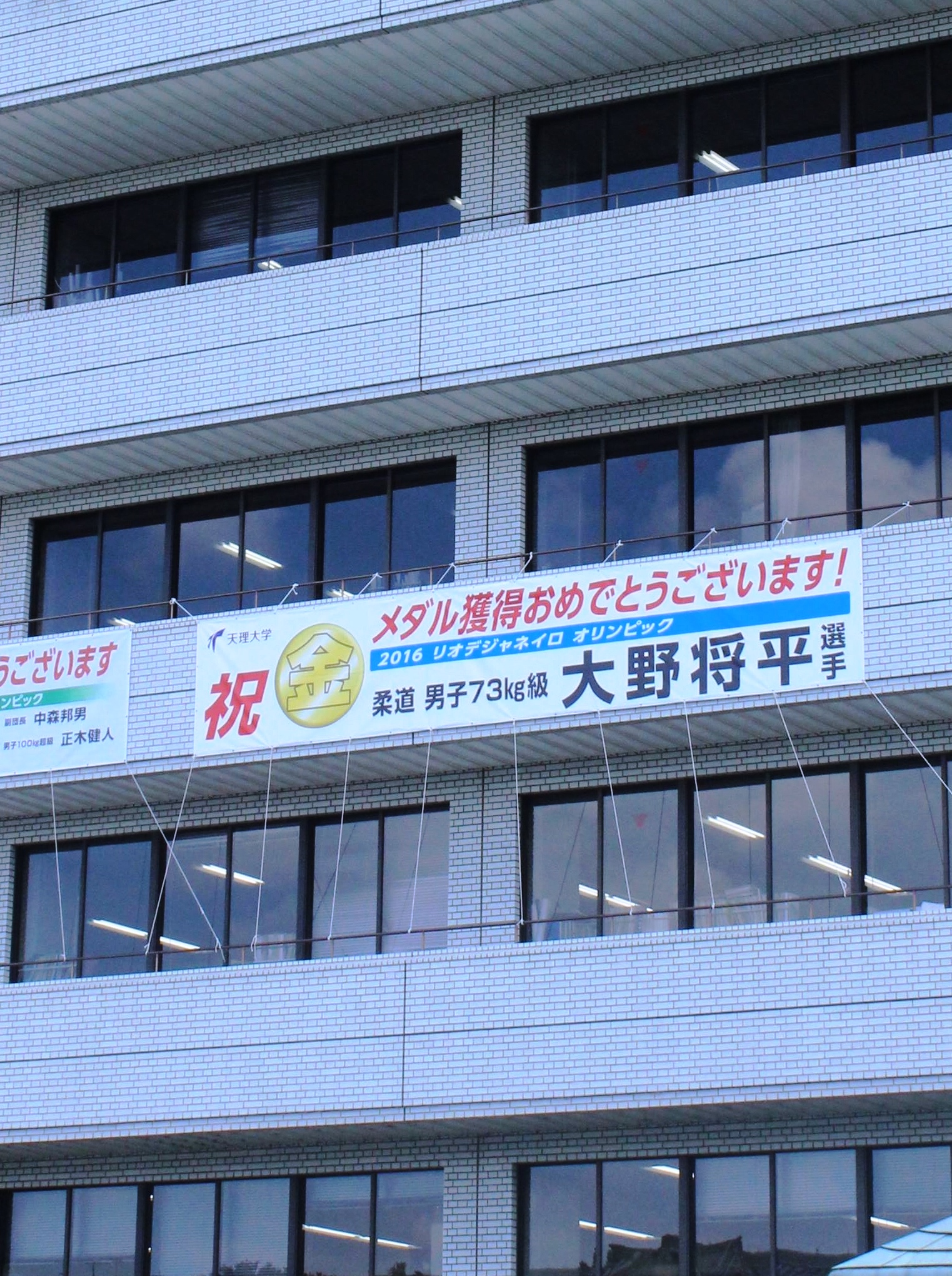 リオデジャネイロ五輪の柔道男子73キロ級で、金メダルを獲得した大野将平選手(24)の出身校・天理大がある天理市では9日、商店街や市庁舎などに横断幕が掲げられ、祝福ムードに包まれた。