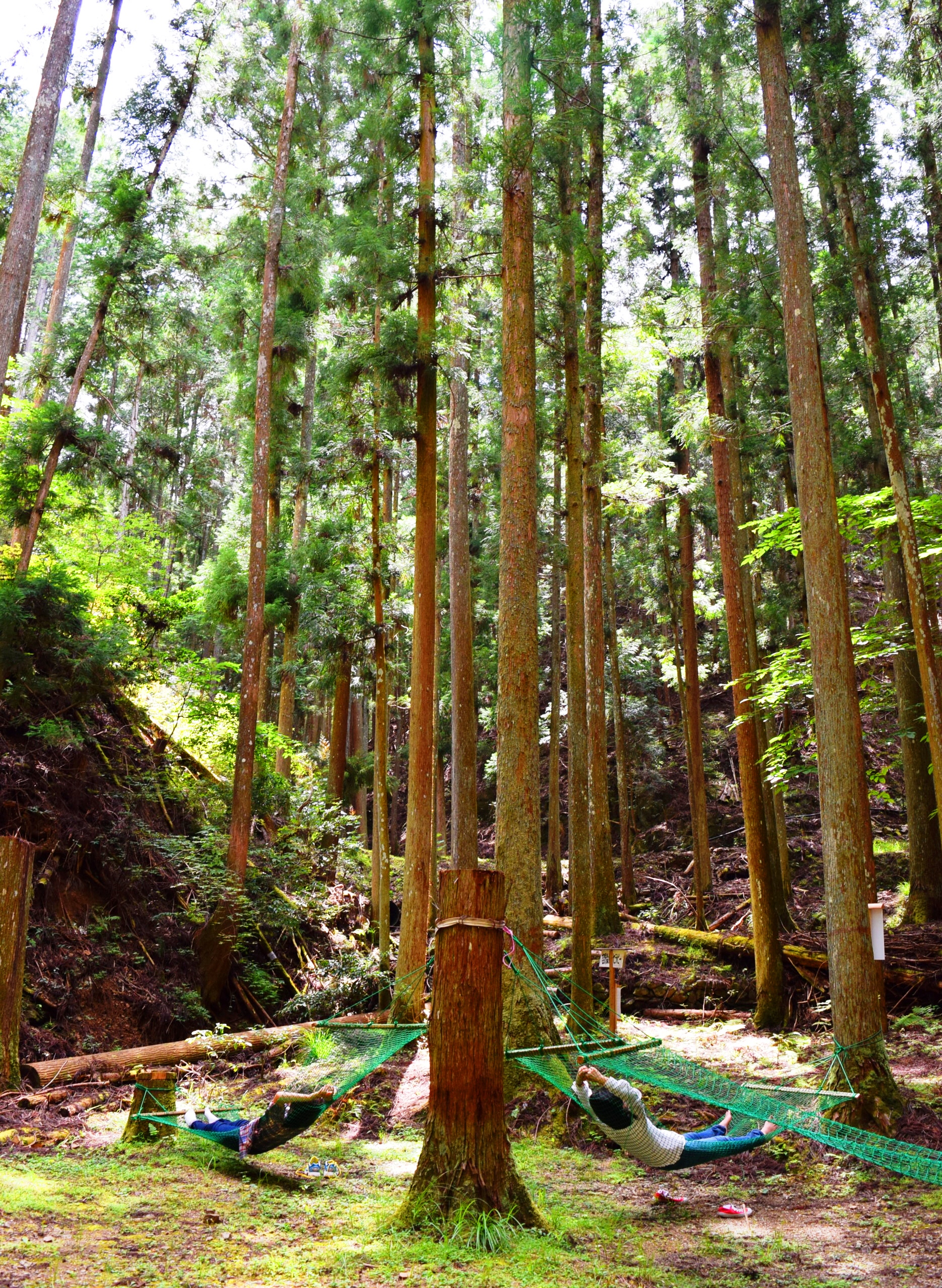 スギやヒノキの木立の間を通る山道では、木々の間を抜ける風がひんやりさわやか。こもれび広場では、手作りのハンモックに寝転んでのんびり過ごした。