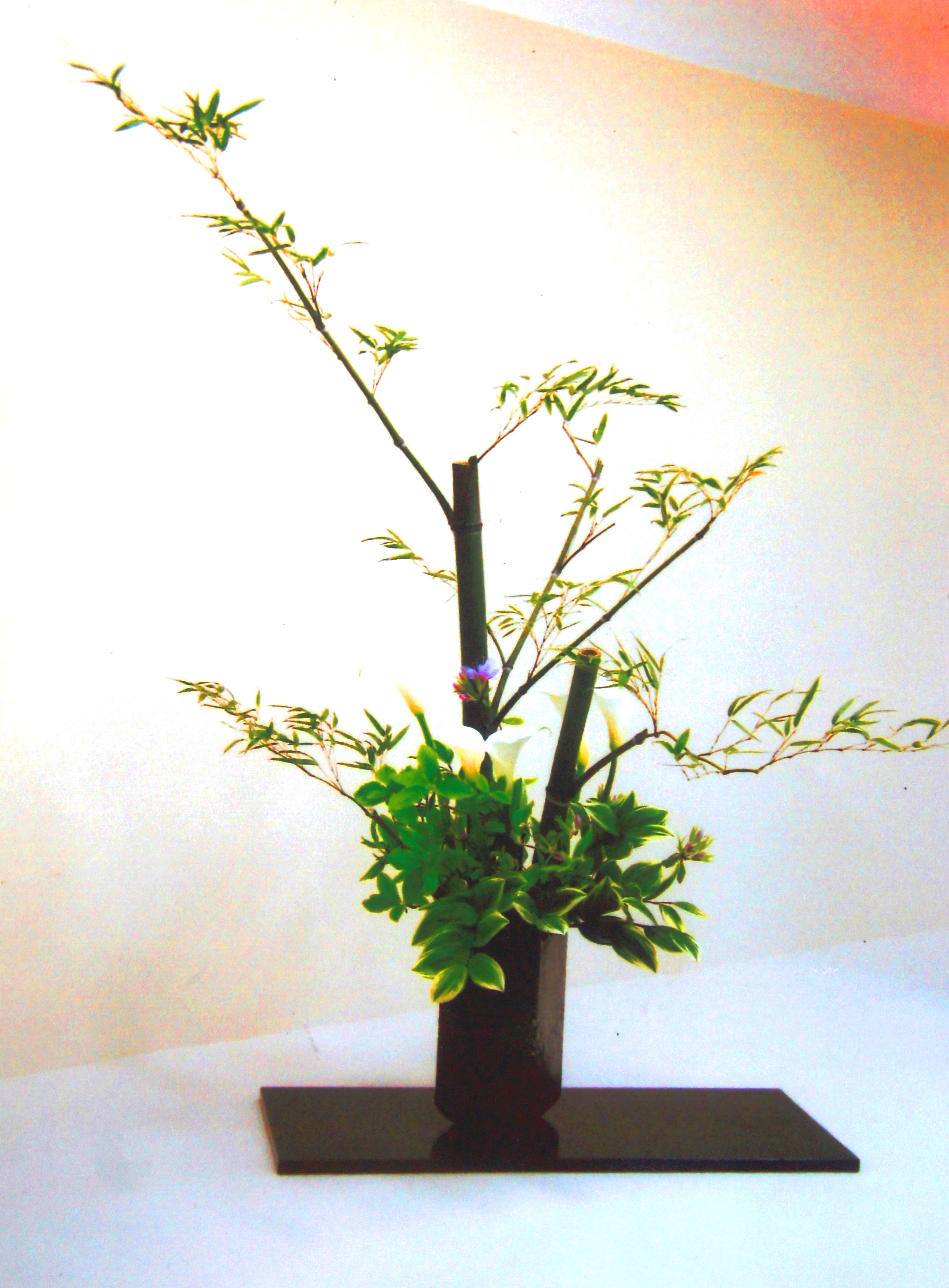 【花材】竹、白カラー、鳴子百合、山つつじ
