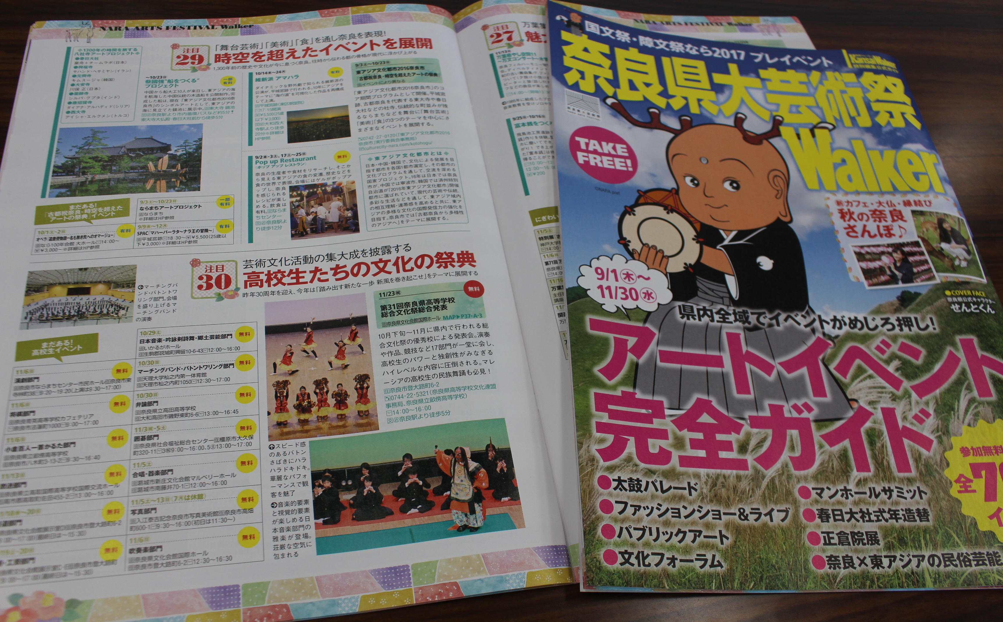 県では公式ガイドブック「奈良県大芸術祭Walker」を発行。A4判のカラー40ページで、県内の主な文化施設や観光案内所、各市町村、近鉄主要駅、JR奈良駅などで無料配布している。ガイドブックには、会場マップや注目イベントを詳しく取り上げているほか、県内の社寺の催しなど〝秋の奈良の魅力〟も紹介している。