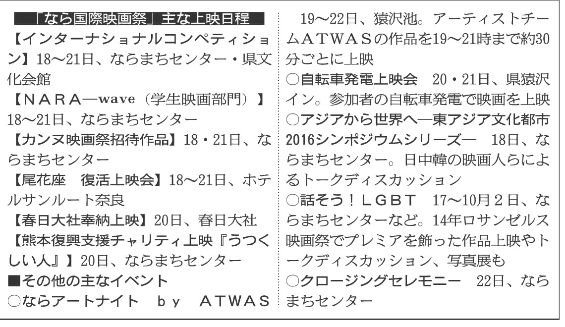 クロージングセレモニーは22日正午から、ならまちセンターで。今年のカンヌで「ある視点」部門審査員賞を受賞した深田晃司監督の「淵に立つ」が全国公開に先駆けて上映され、各コンペの審査結果などが発表される。