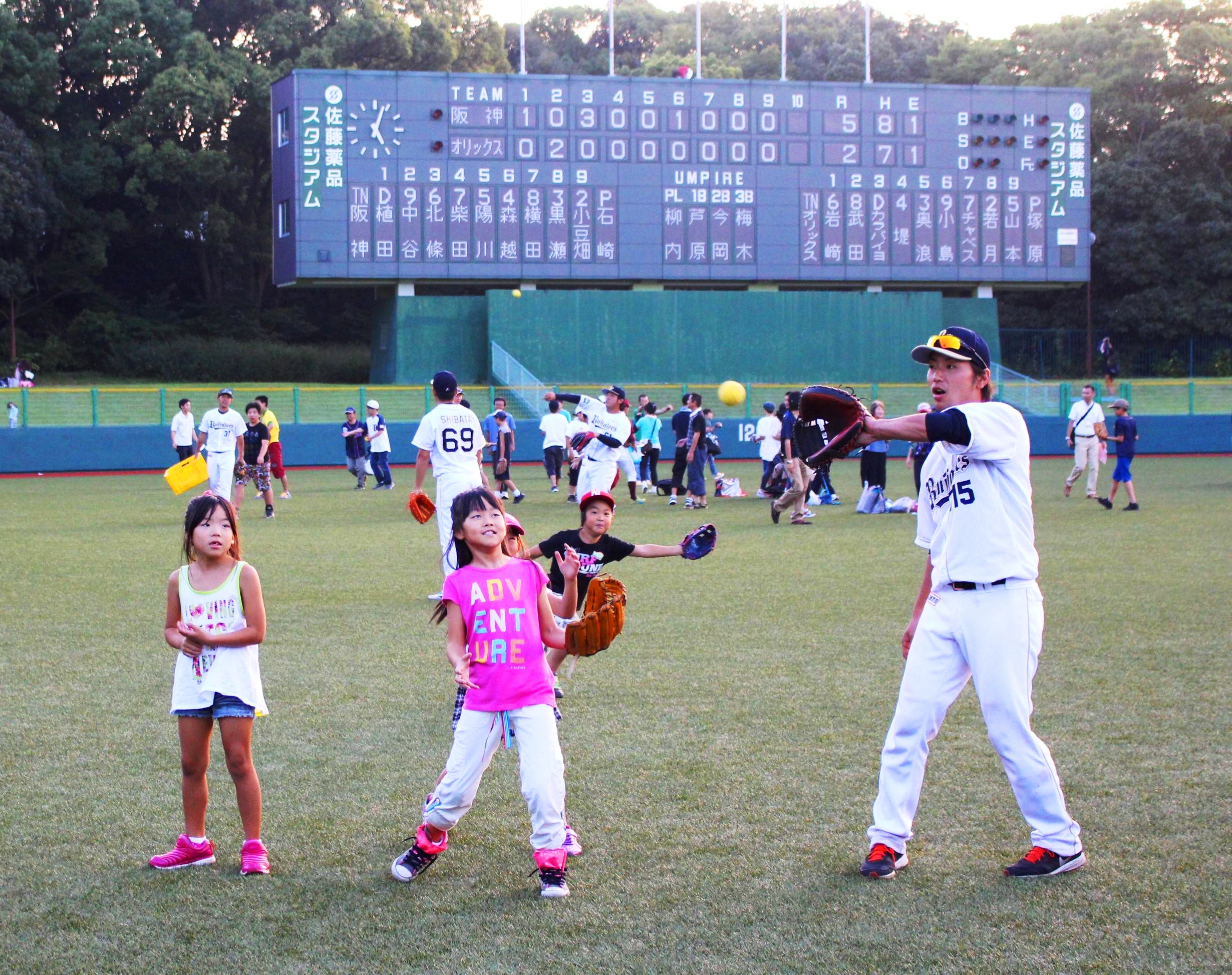 この日は、球場名がワンデイニックネームで「佐藤薬品バファローズスタジアム」となり、天理大の学生も観客の整理やチケット回収などの運営に参加。試合前に選手のサイン会、親子でのスタメン紹介が行われ、試合後には少年少女野球教室が開かれるなど、選手とファンたちが交流を深めた。
