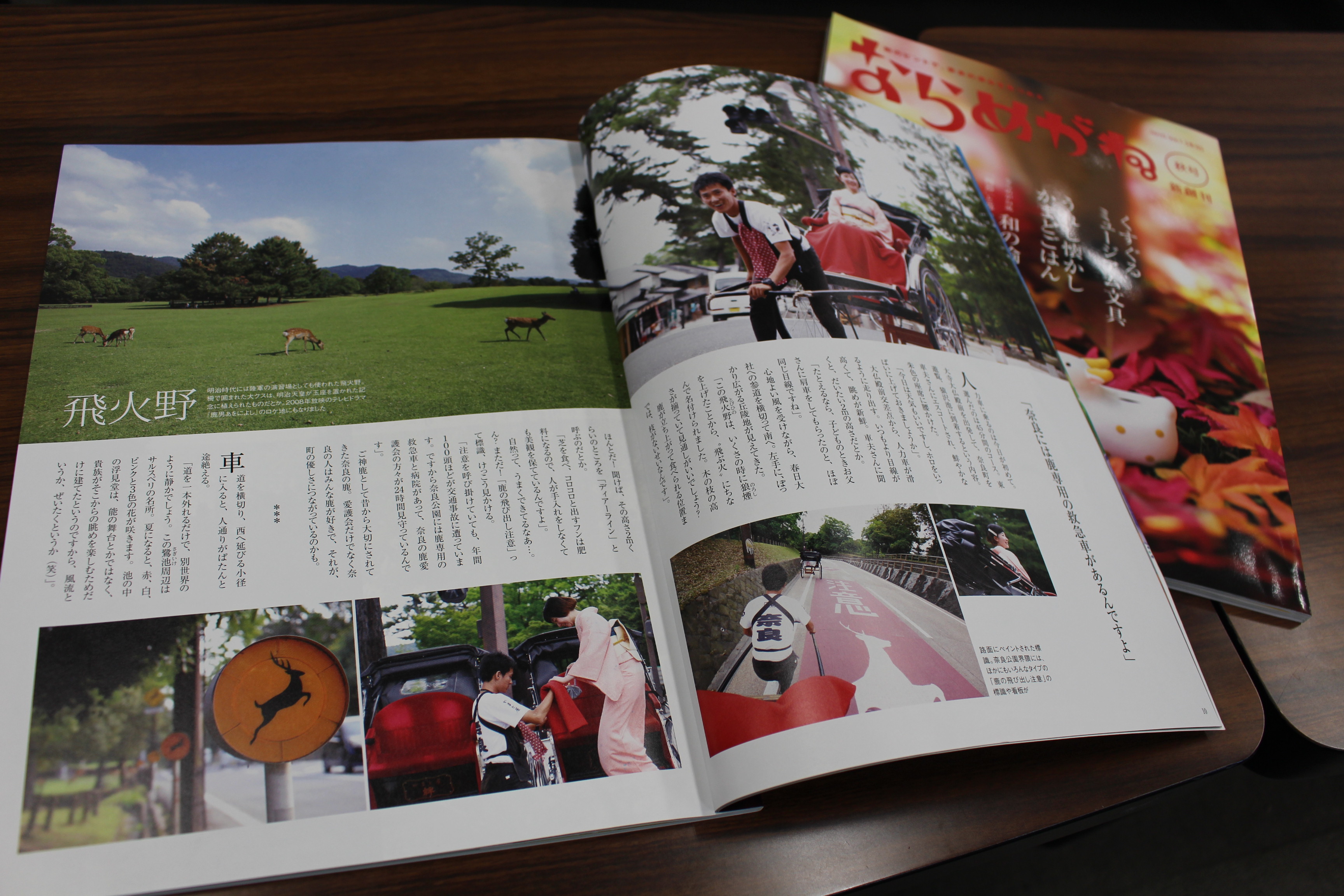 創刊号はA4より少し幅が広い形で、写真をふんだんに使ったオールカラーの約100ページ。メーンの特集では「一段高みの奈良町見物」と題して、古都・奈良の人力車にスポットをあてた。