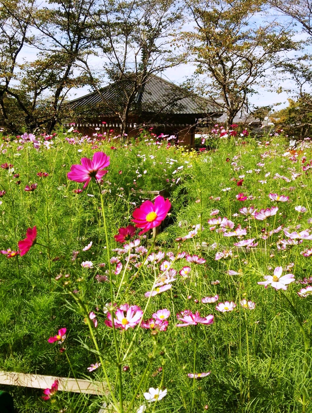 桜井市阿部の安倍文殊院に約30種約5万本のコスモスを植えてつくった「コスモス迷路」(約500平方メートル)がオープン。赤や白、黄色、ピンクなどの花が咲き誇り、見ごろを迎えている。