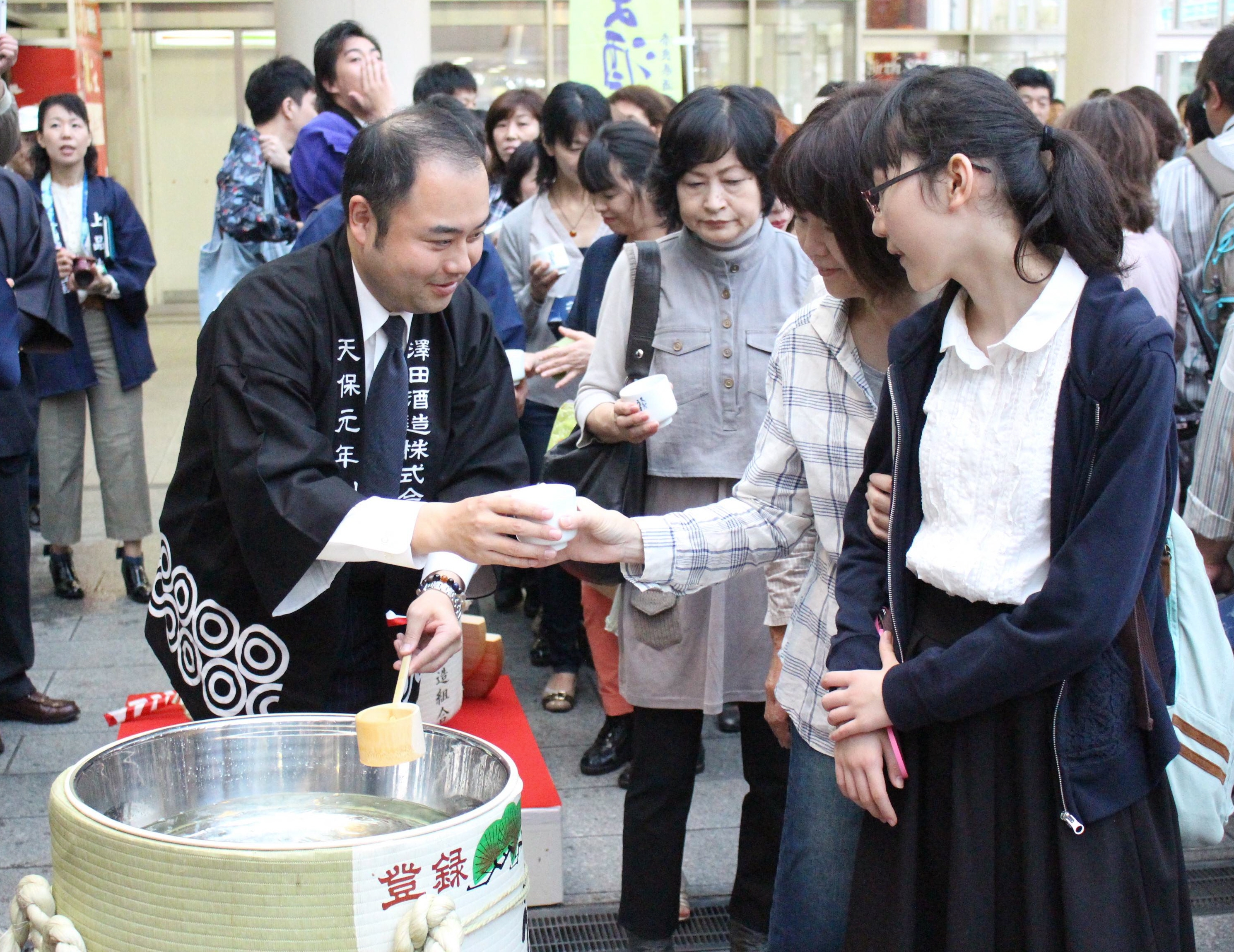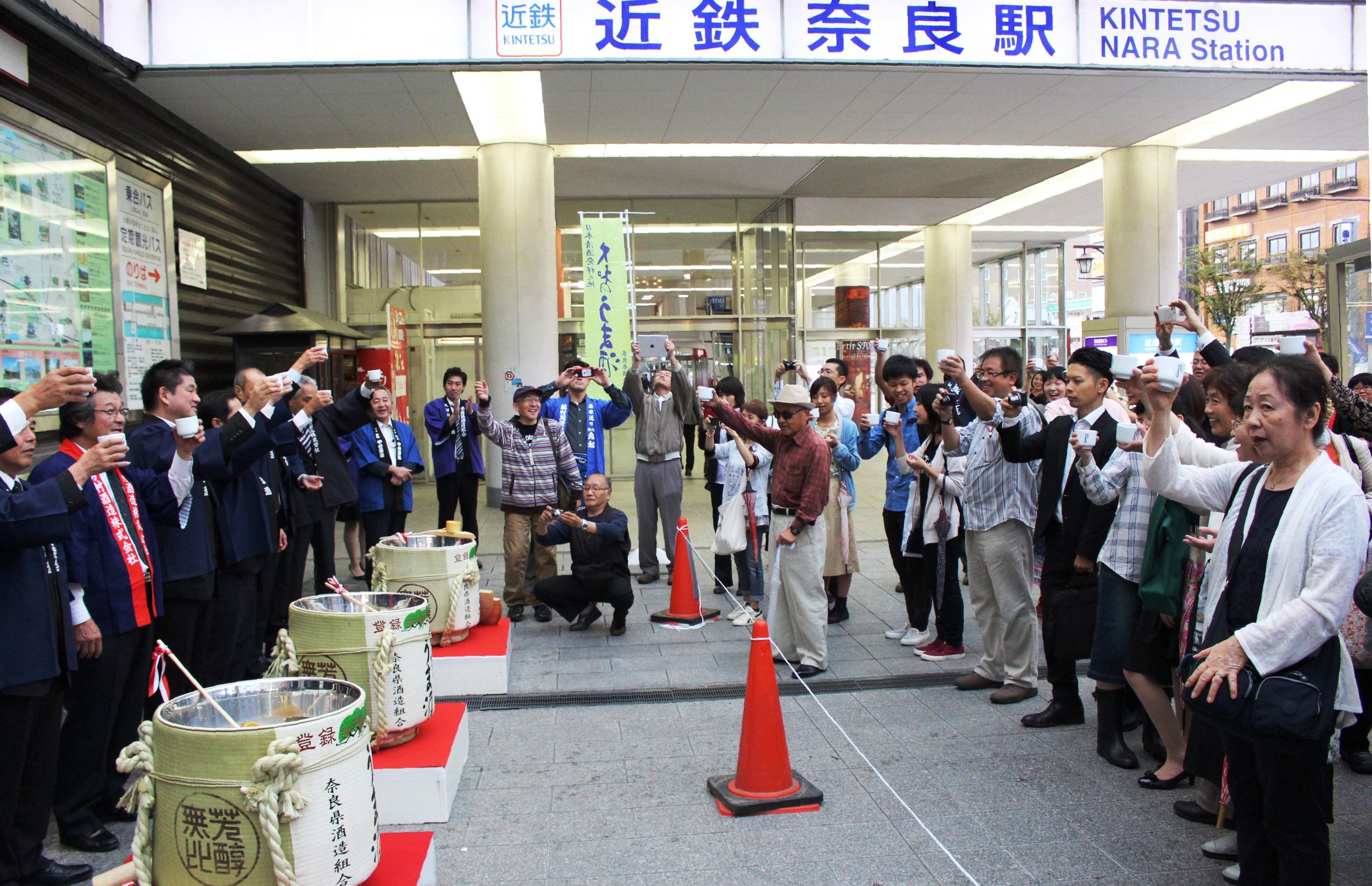 10月1日は、日本酒造組合中央会が定めた「日本酒の日」。県酒造組合でもこの日、「清酒発祥の地 大和のうま酒で乾杯!」と銘打ったイベントを近鉄奈良駅前で開催し、蔵元28社が日本酒を振る舞った。