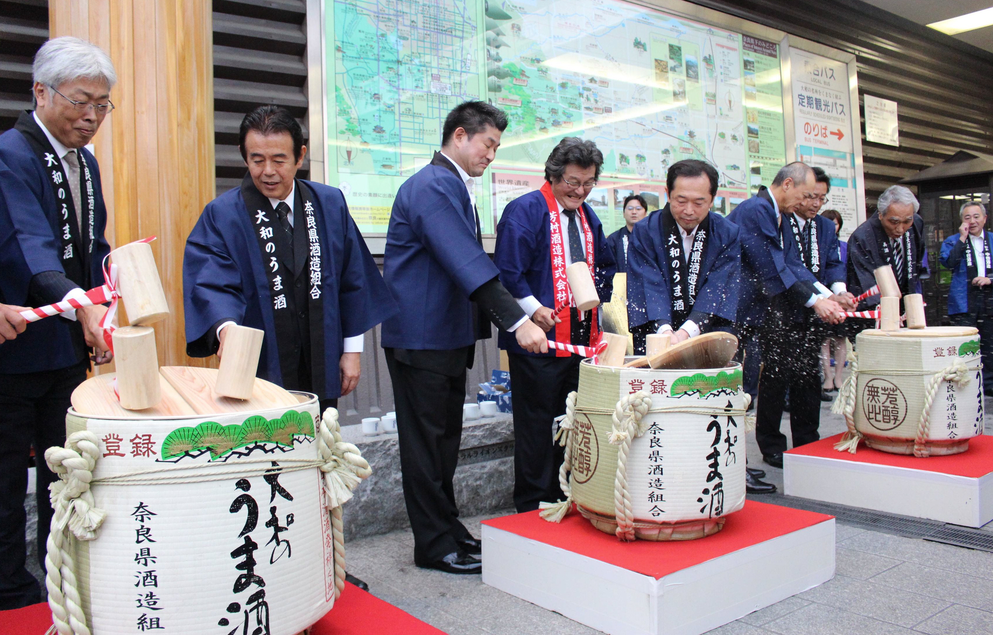 組合中央会が主催した「全国一斉日本酒で乾杯!」の一環として実施。県酒造組合の芳村隆博会長が「奈良は日本酒発祥の地。今日は蔵元自慢の酒がそろっているので、楽しんでほしい」とあいさつした後、鏡開きが行われ、来場者らに酒を配って一斉に「乾杯」した。