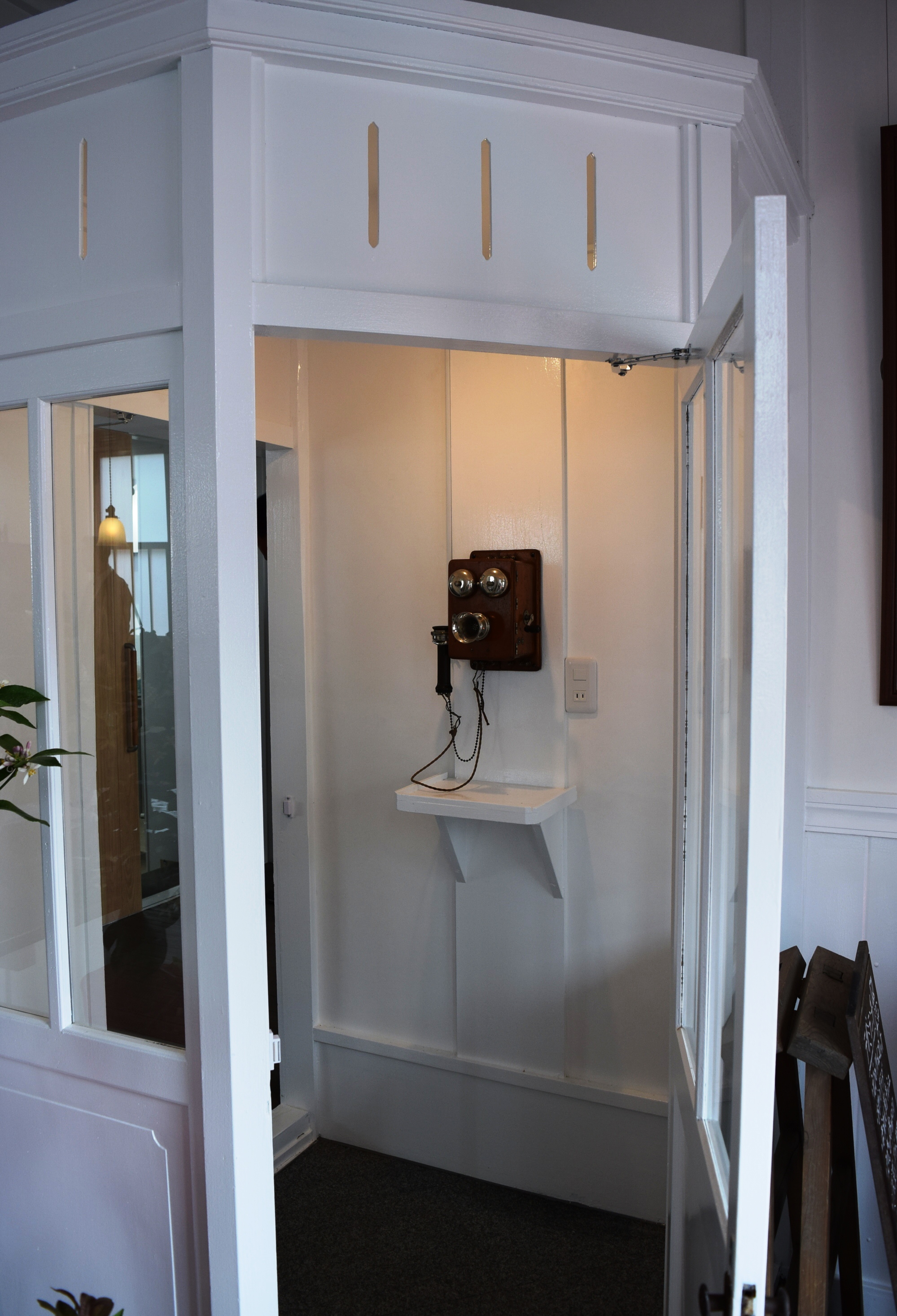 桟木で郵便記号をデザインした玄関の扉、円弧を連ねた軒先の飾りなど、細部にまでこだわった造りはそのまま。レトロな公衆電話室も再生された建物はどこか懐かしく、温かい気持ちにさせてくれる。(山本岳夫)