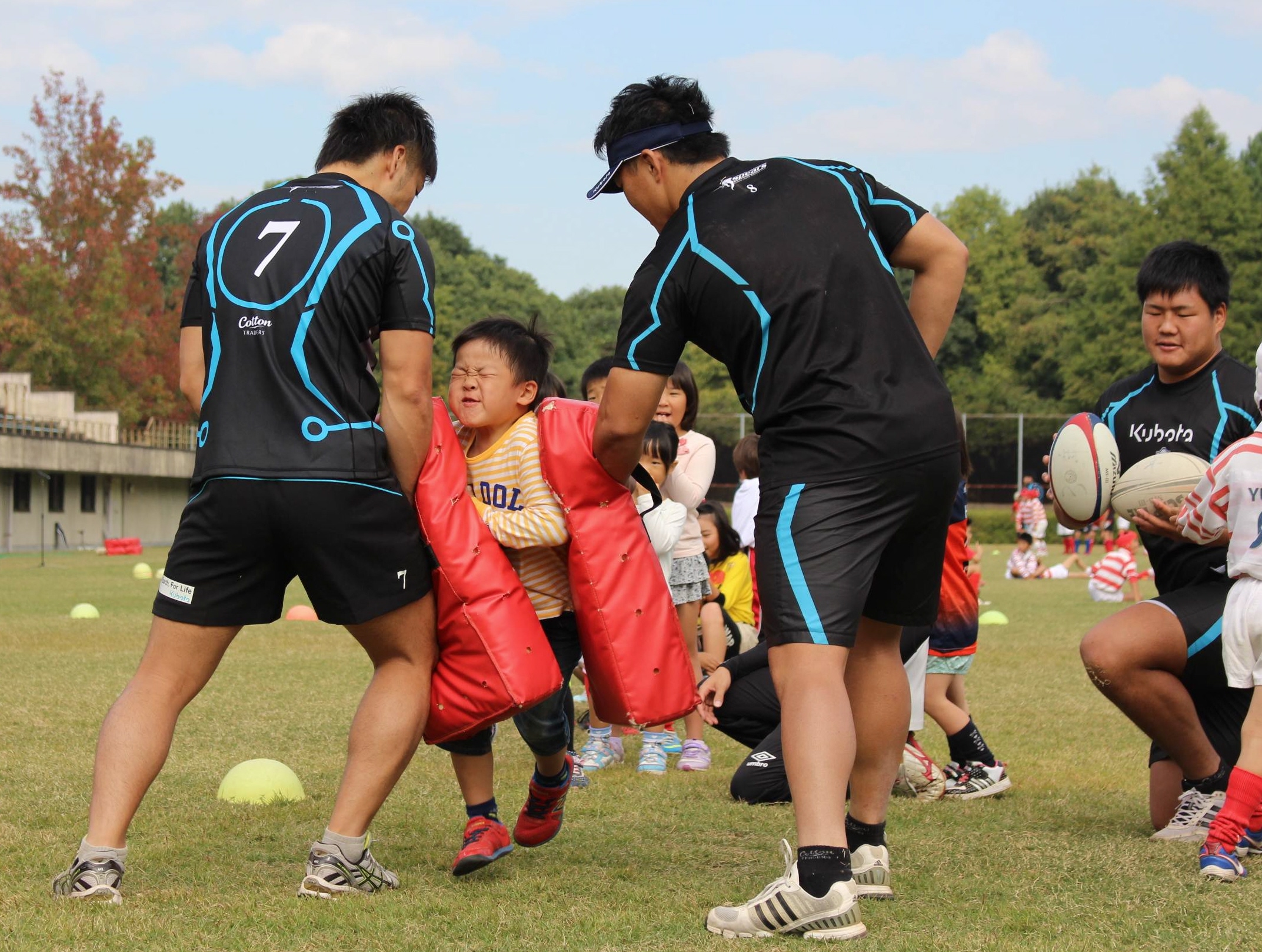 参加した天理市の小学5年、紺谷凌空君(10)は「選手たちと一緒にラグビーができてとても楽しかった。立川選手は体が大きくてかっこよかった。来年も開かれれば参加したい」と笑顔を見せた。