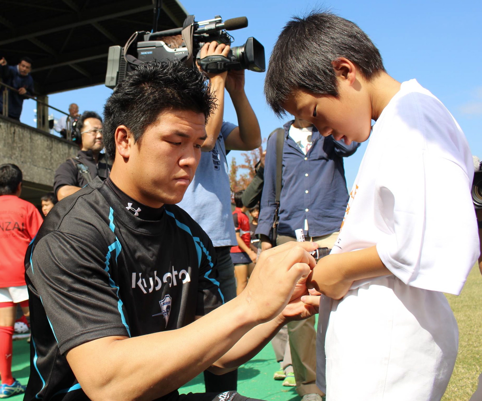 選手らは県内のラグビースクールに通う子供やラグビー初心者の参加者らも交えて横一列に並ぶと、走りながらパスを回すラインパスや、蹴られたボールをキャッチするレシーブの練習などを指導。交流会も開かれ、多くの保護者や子供らが立川選手にサインを求めたり、記念撮影を楽しんだりしていた。