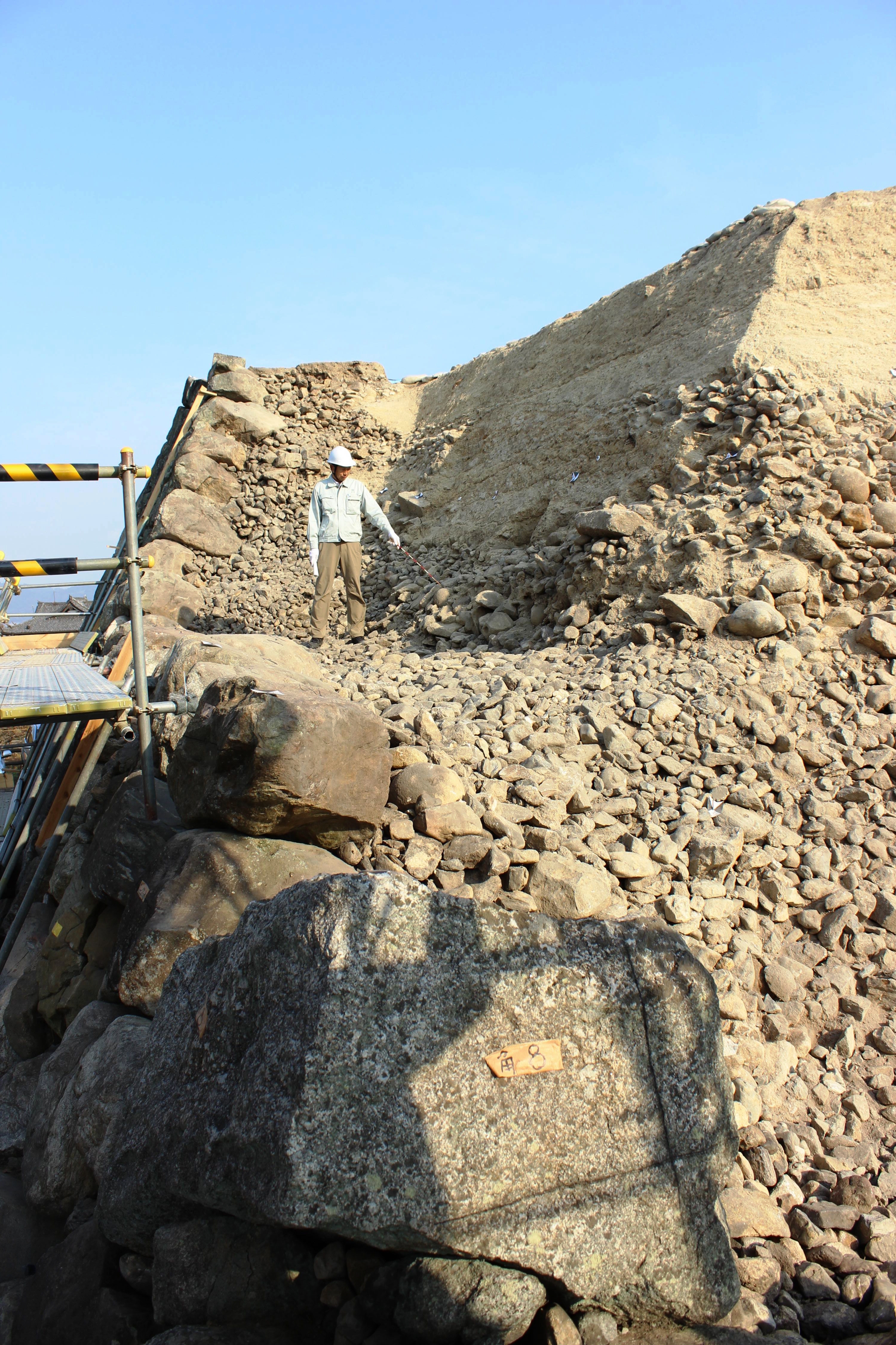 石垣は高さ約9メートル。表面の築石の奥に裏込め石、その下は盛り土の3層構造だが、東面以外で石垣の変形やずれ、ふくらみが確認されたため今年8月、崩落防止の解体工事に着手。築石は最も重いもので2・8トンあり、全2716個中236個を解体したという。