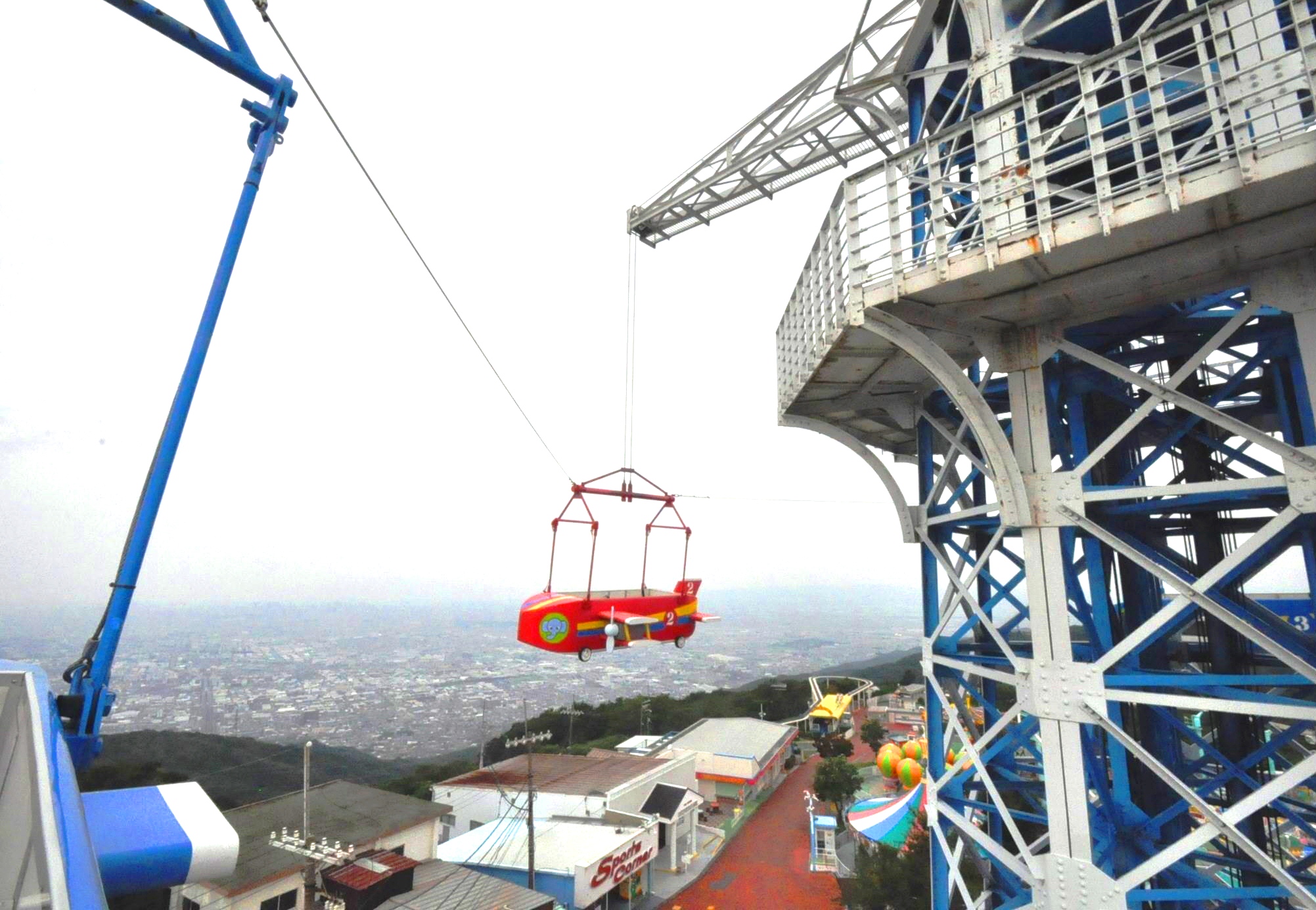 飛行塔は、高さ約30メートルの鉄製で、4本の腕に人が乗る飛行機型の乗り物をつり下げ、高さ20メートルほどまで上がりながら旋回する。一番上まで上がれば、奈良盆地や大阪湾、比叡山、京都市街まで見渡すことができる眺望の良さも人気だ。