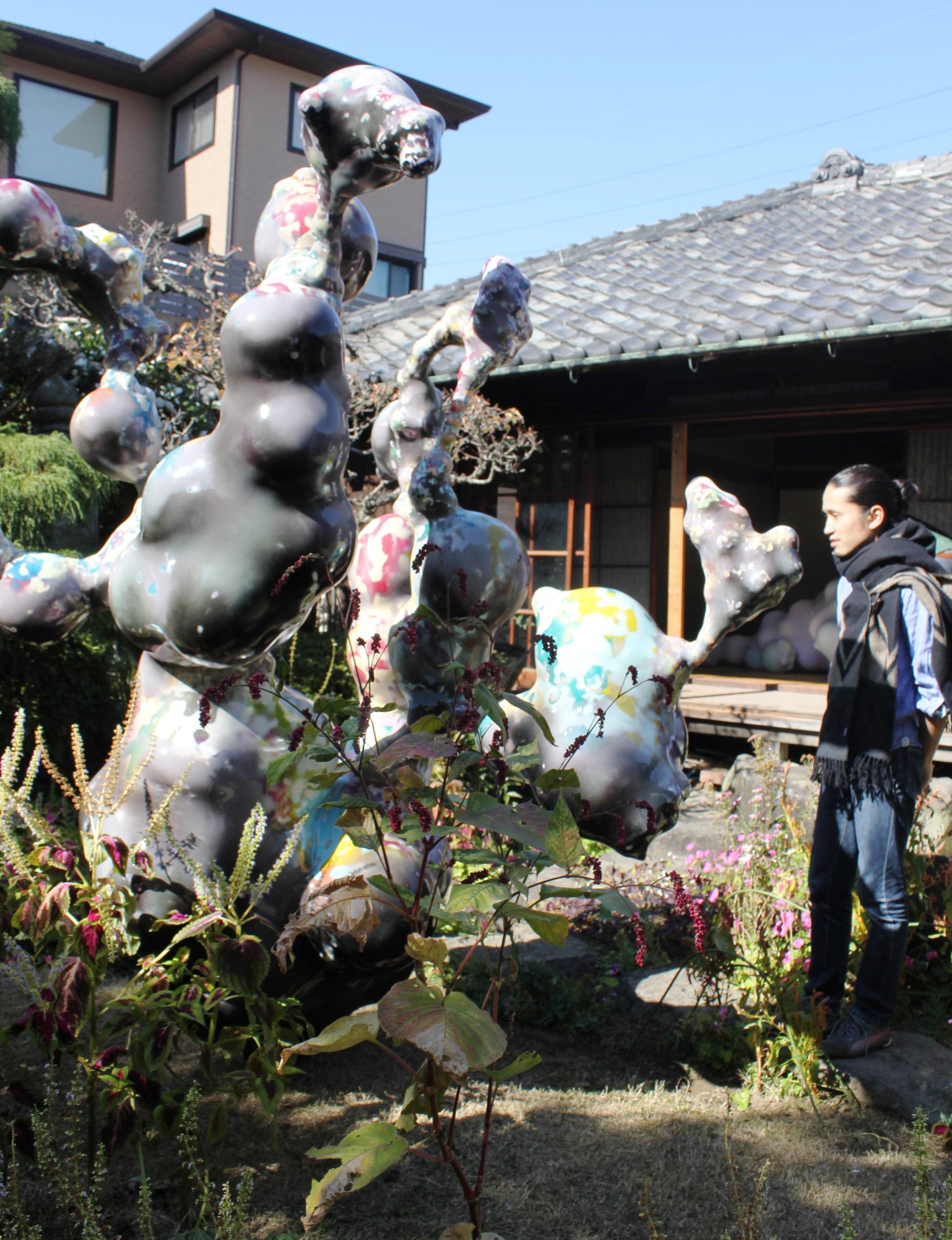このうち大和文華館文華ホールでは、学園前に生まれ育ち、山形に移った三瀬夏之介さんの巨大なびょうぶ作品が見る人を圧倒する。逆に奈良に移り住んだ狩野宏明さんの作品や、帝塚山大学、奈良教育大学、東北芸術工科大学の学生らが制作した作品も。また、同館に近い中村家住宅の庭には、奈良出身のクニトさんのユニークな造形作品が展示され、周囲の草花との調和がおもしろい。
