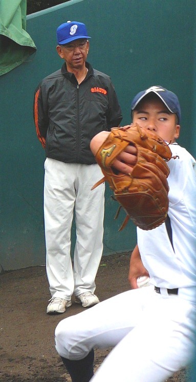 選手らはグラウンドでウォームアップをした後、投手と捕手の2組ずつで練習。堀内さんは「手の甲を投げる方向にまっすぐに向けて」、「体が左側に流れないように」など身ぶり手ぶりを交えながら選手らにアドバイス。気迫の込もった指導に、選手らはひきしまった表情で球を投げていた。