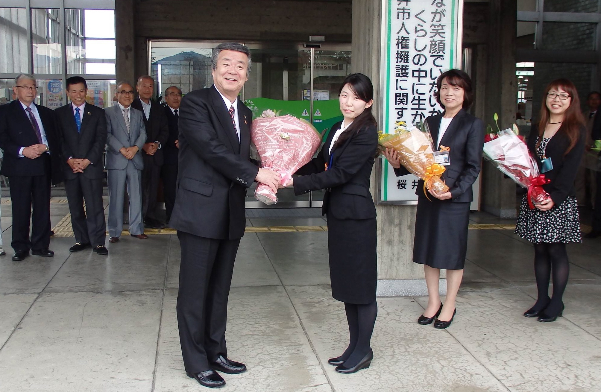 桜井市長選で再選をはたした松井正剛氏(62)が17日、初登庁。支持者や市職員らに出迎えられ、女性職員らから花束を贈られると笑顔を見せた。