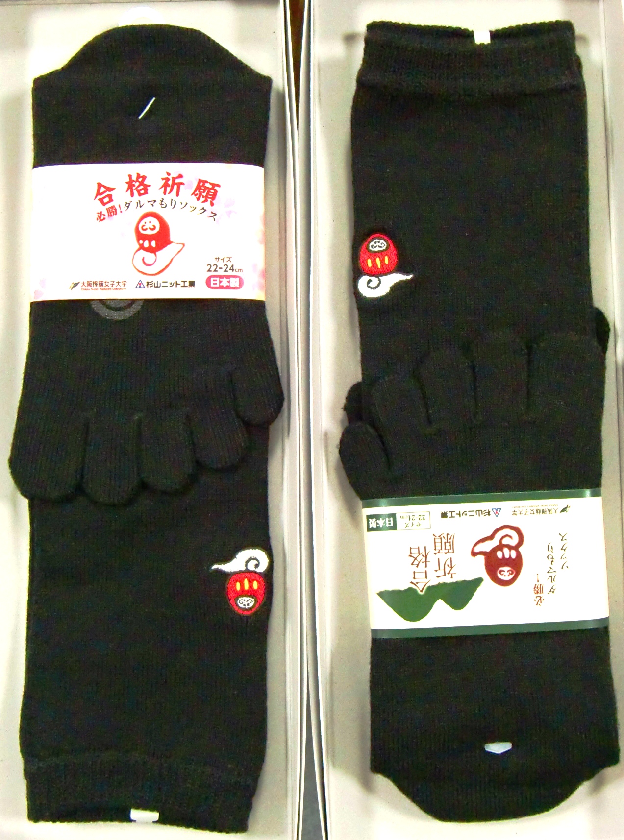 大阪樟蔭女子大(大阪府東大阪市)と香芝市の靴下メーカー「杉山ニット工業」(杉山浩之社長)が共同で、合格祈願の女性用靴下「ダルマもりソックス」を開発、商品化した。学生たちは「女子中高生にもかわいいと思ってもらえるデザインなので、学校にも履いていけると思う。受験生を応援したい」と話している。