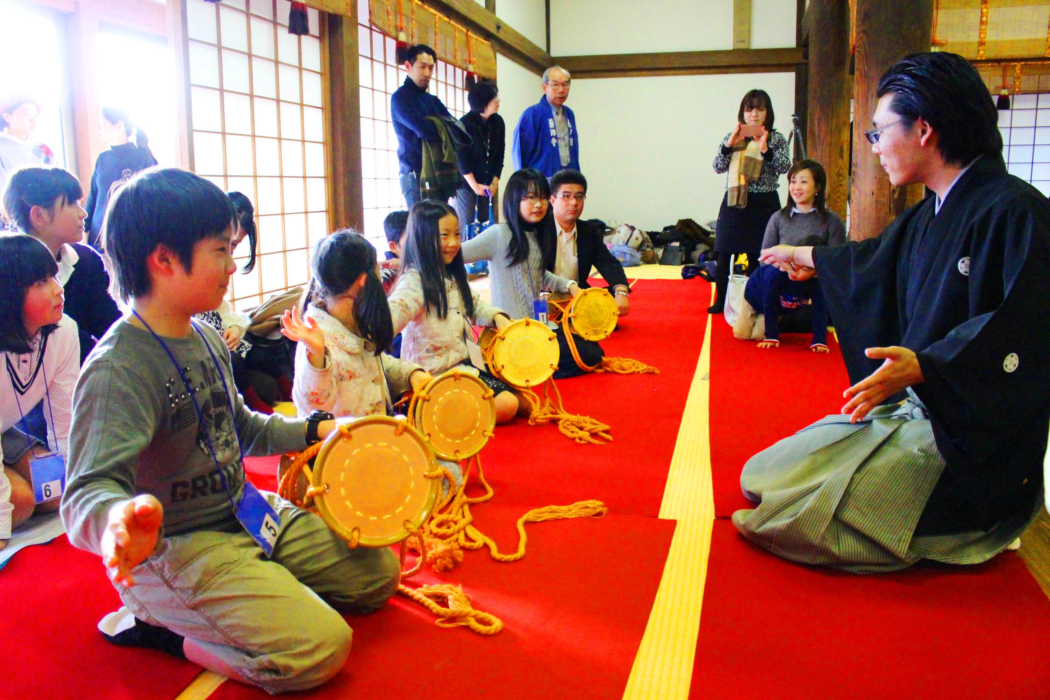 講師に教わりながら大鼓を打って能の魅力に触れる子供たち