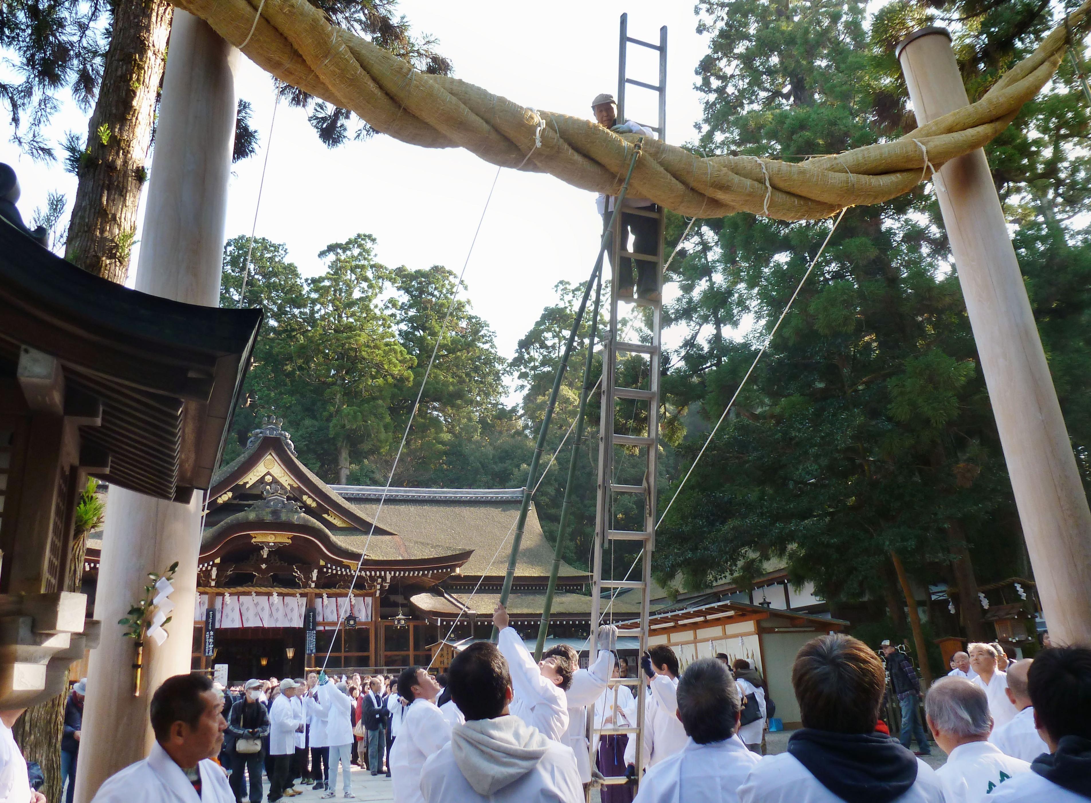 桜井市の大神神社で13日、正月を控え、拝殿前の大しめ縄が取り換えられた。大阪府岸和田市の氏子らでつくる団体の約70人が4本作り、奉納した。