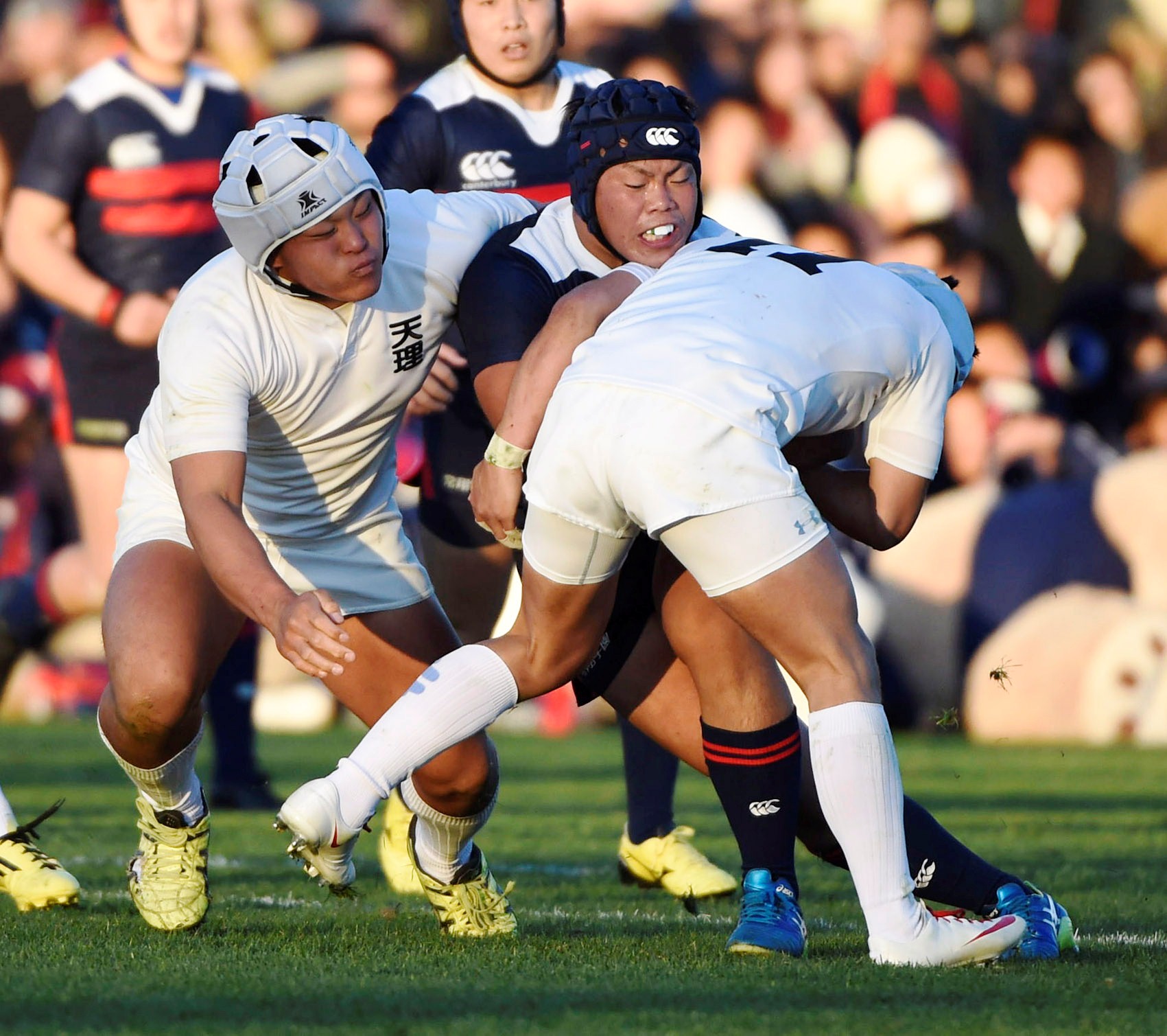 【天理-常翔学園】後半、常翔学園の突進を阻むWTB小川(手前)ら天理の選手。堅守でシード校をノートライに封じた