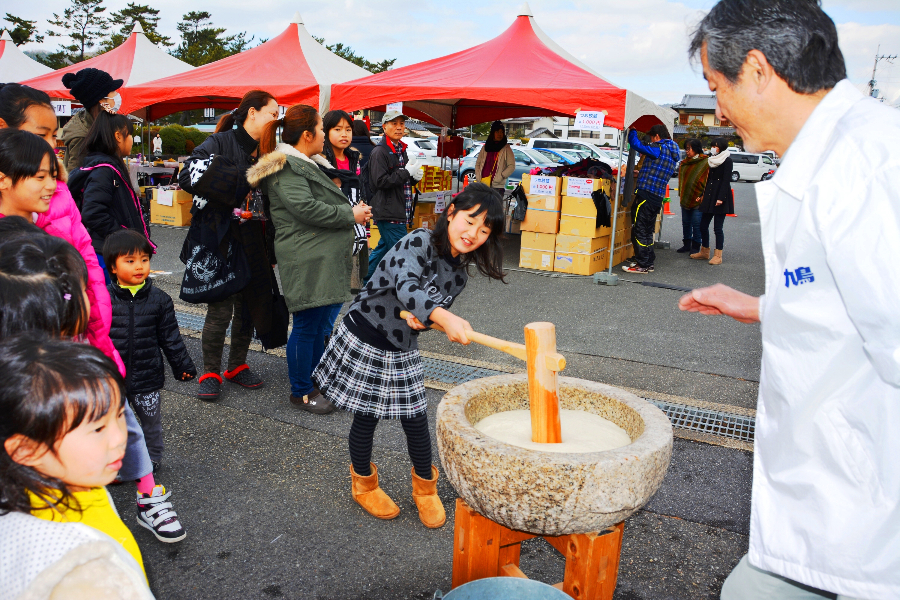 斑鳩町産のもち米を使用した餅の振る舞いもあり、子供らが餅つきを体験し、つきたての餅をほおばっていた。