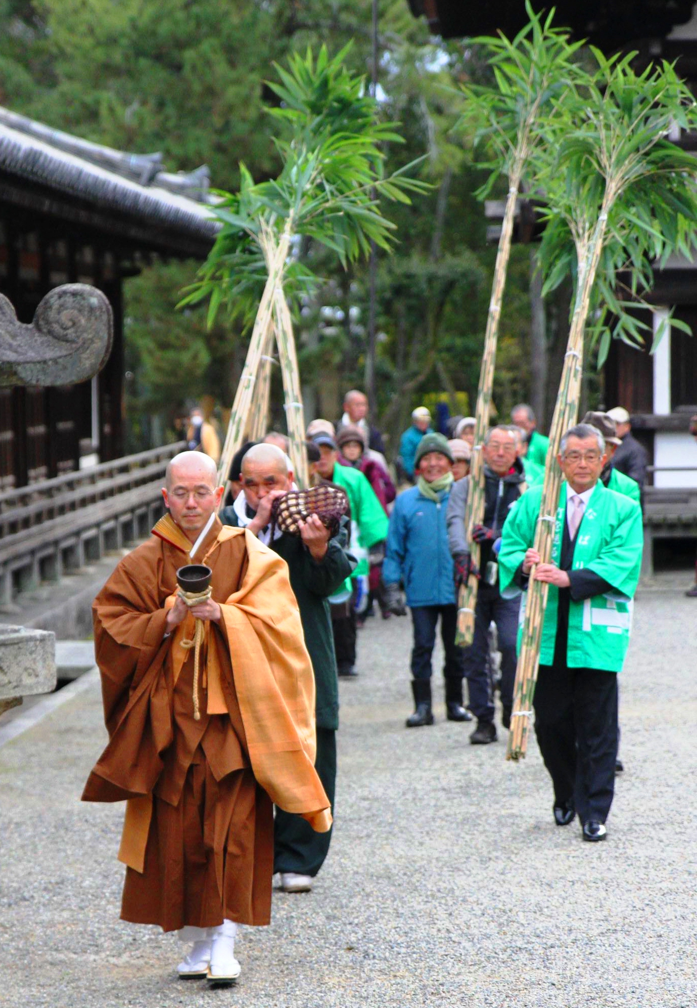 19日、会員ら約50人が同寺に竹を届け、中興堂で奉納法要が営まれた。同会の奥西勲会長(74)は「今年もいい竹を届けることができた。文化を守るためにもこれからも続けていきたい」と話していた。