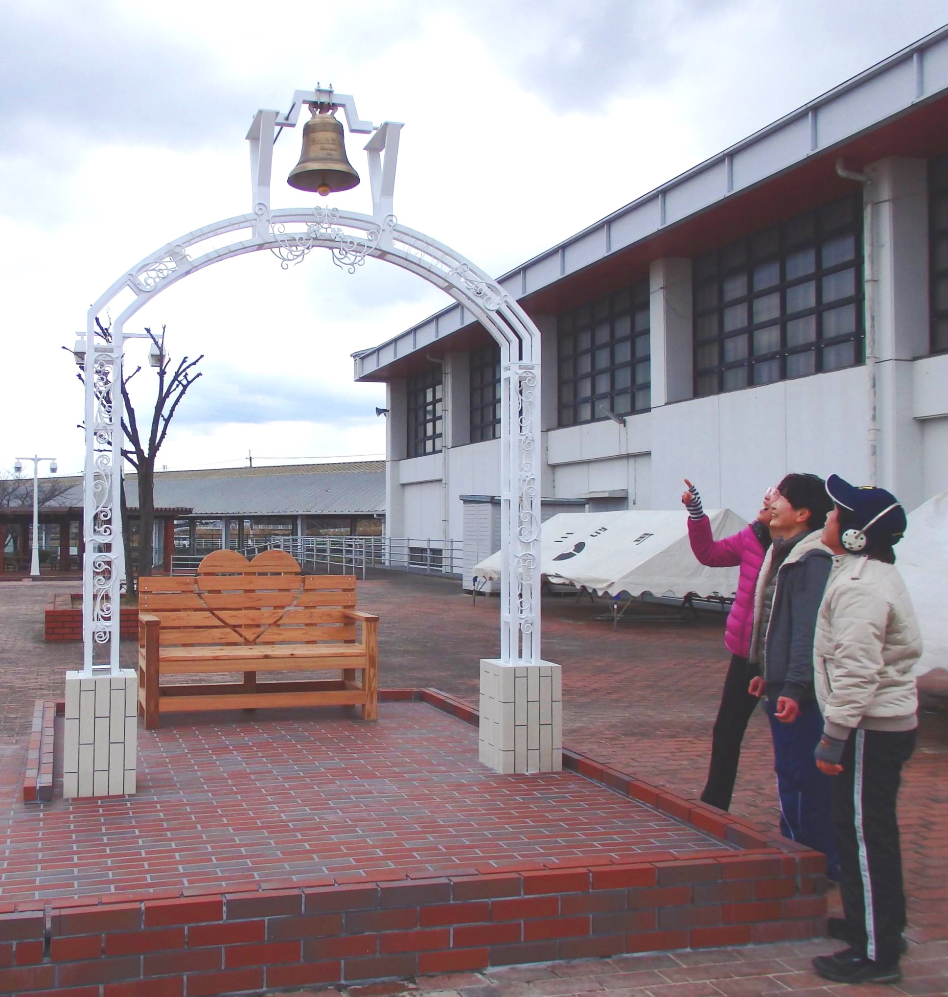 ベルモニュメントは鉄製で高さ約3・1メートル、幅約2・2メートル。一番上にブロンズ製の鐘が付き、そばに県産の杉材を使ったラブチェアが置かれている。