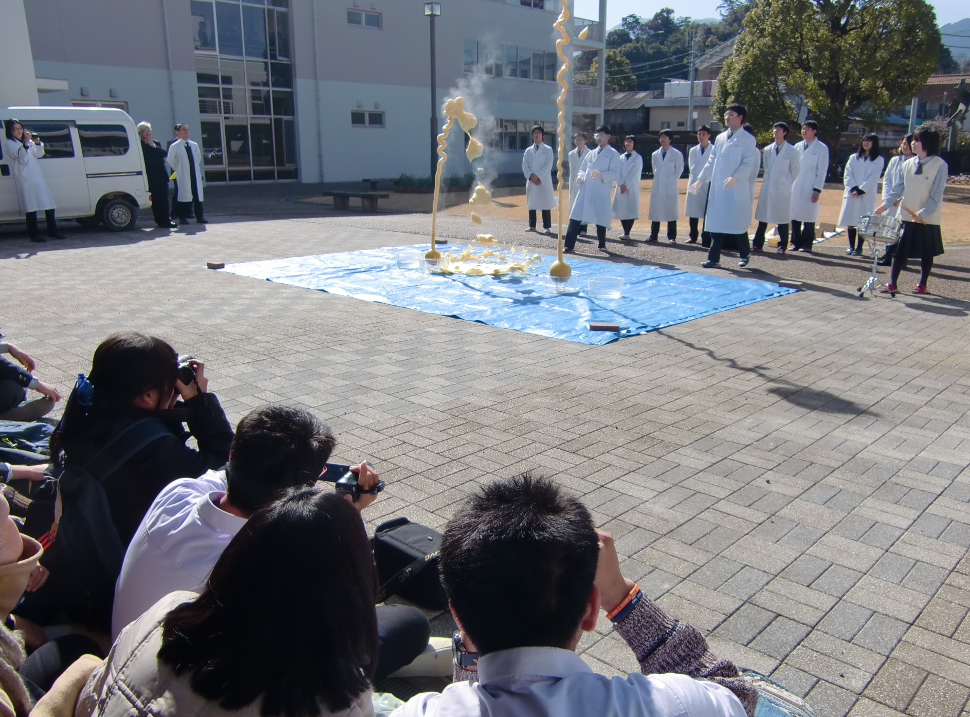 一行は青翔中・高校で生徒らと一緒に数学などの授業を受けたほか、科学部の生徒が化学反応の実験を披露。高校2年で同部の小倉舞子部長は「落ち着いて実験ができました」と話していた。