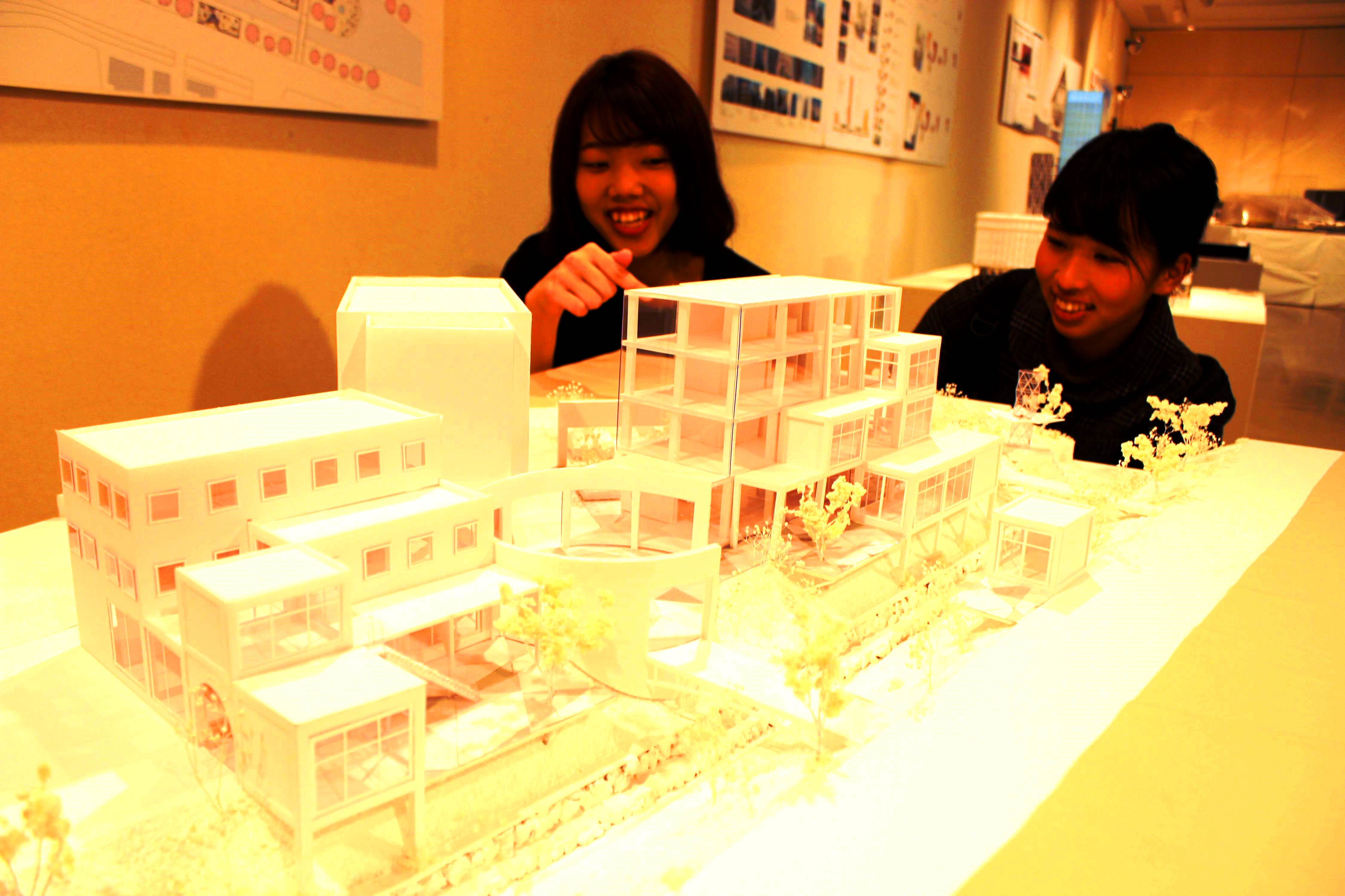 同学科の建築・まちづくりコースで学ぶ4年、上地七菜さん(21)は、建築模型材料のスチレンボードを使った作品「高田川沿いのまちのひろば」を制作。「高田川沿いに市民の憩いの場ができればおもしろいのでは」と考え、昨年8月以降、大和高田市を訪れて構想を練り、高齢者マンションやレストラン、広場から成る複合施設の模型を約半年かけて完成。学内で優秀賞を受賞した。