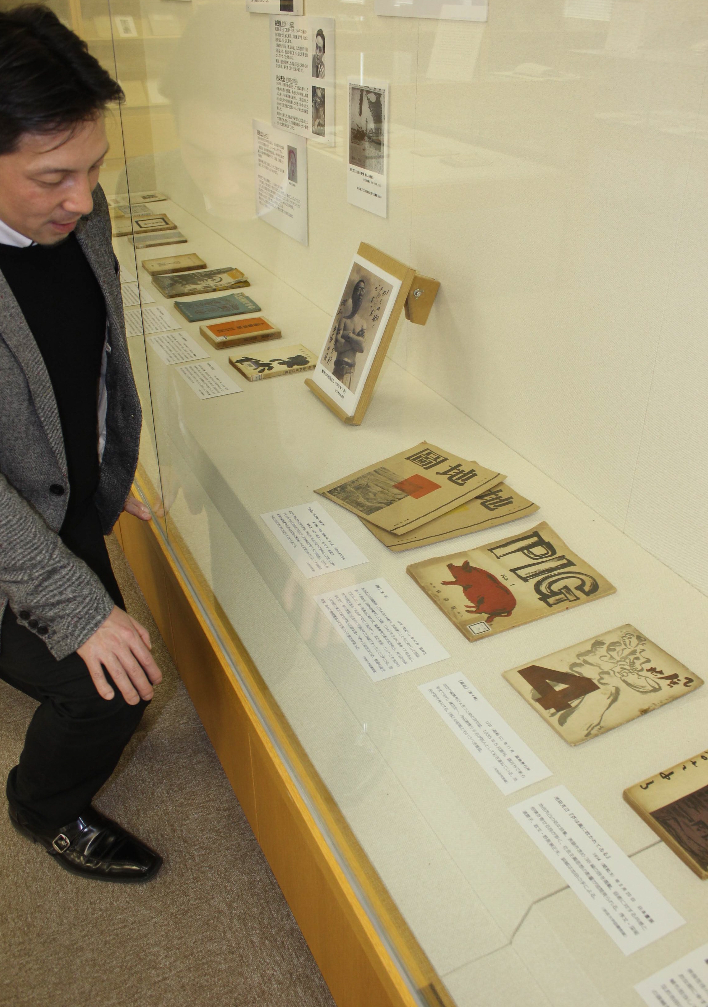 展示は「海の彼方の日本語文学 詩人・池田克己とその時代」として開催、詩集や詩誌、文芸誌など約40点が並ぶ。戦時下の上海周辺で発行された資料の多くは「負の遺産」として処分されたというが、武漢の日本人居留民によって作られた文芸誌などが新たに見つかったといい、忘れられた日本語文化を掘り起こす可能性を持つ貴重な資料という。