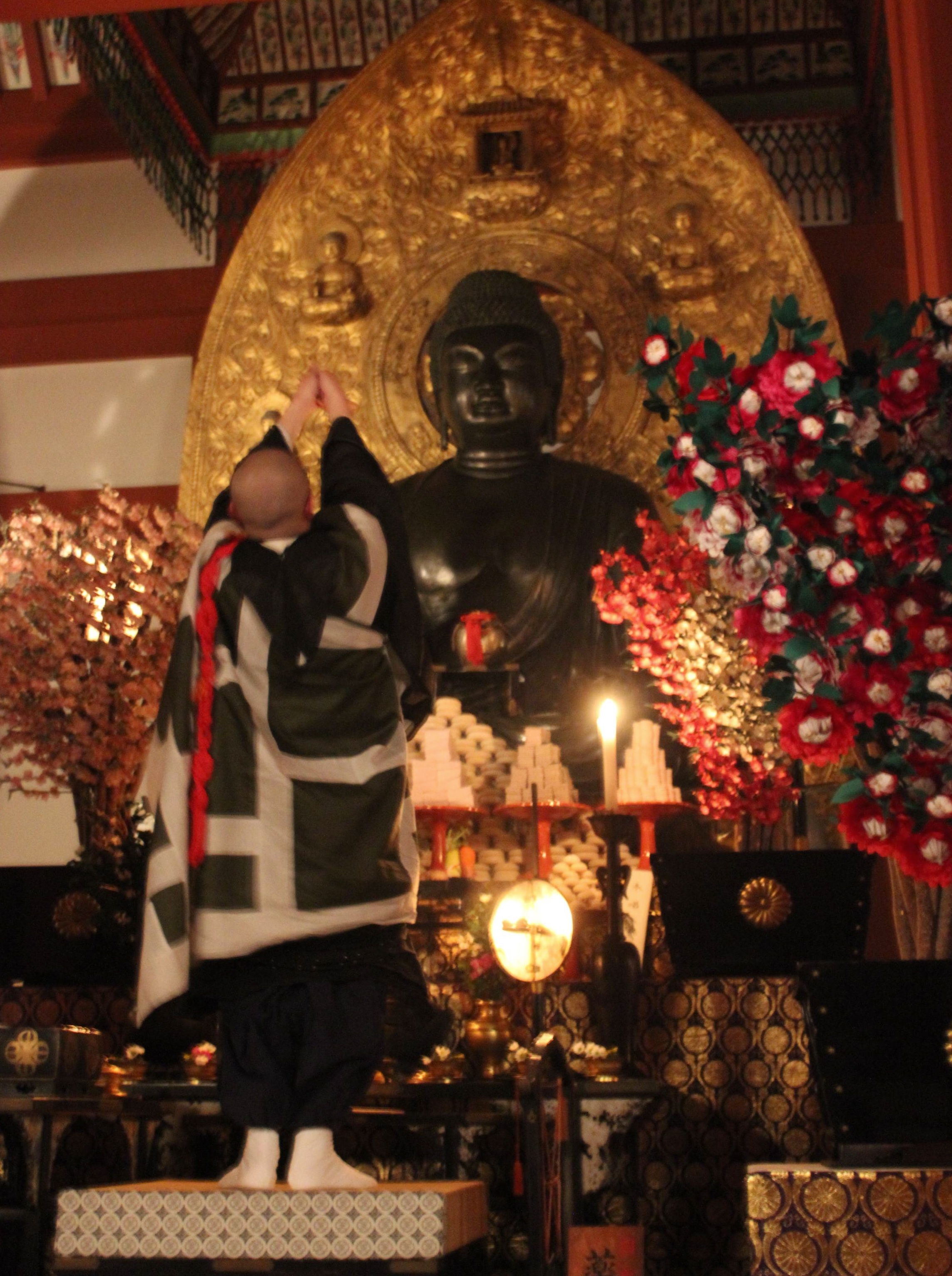 初夜では練行衆の最高位、大導師(村上太胤副住職)の作法が行われ、途中、咒師(加藤大覺録事)が刀を手に駆け巡って邪をはらう作法も。結願の31日夜には鬼追い式も行われる。