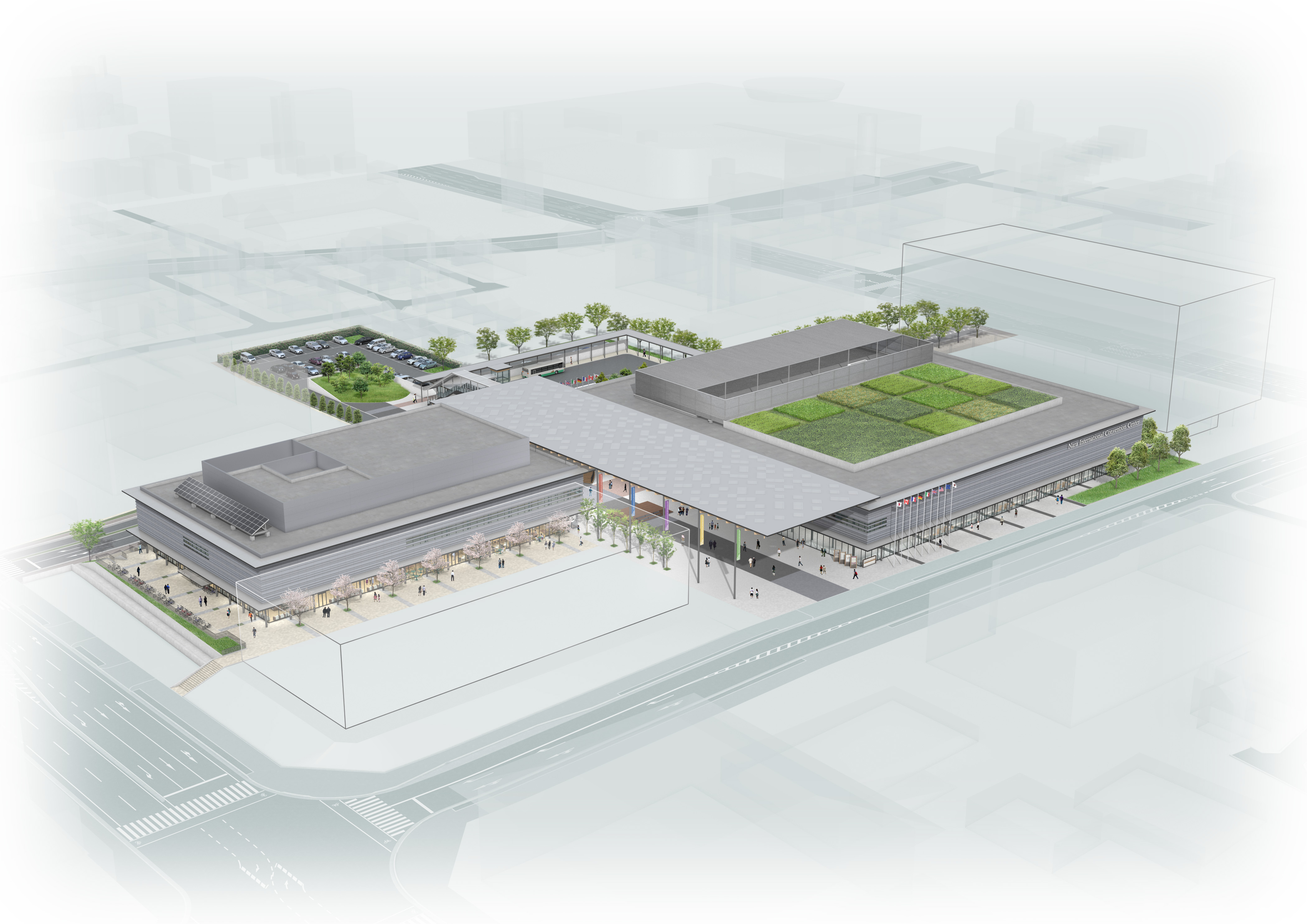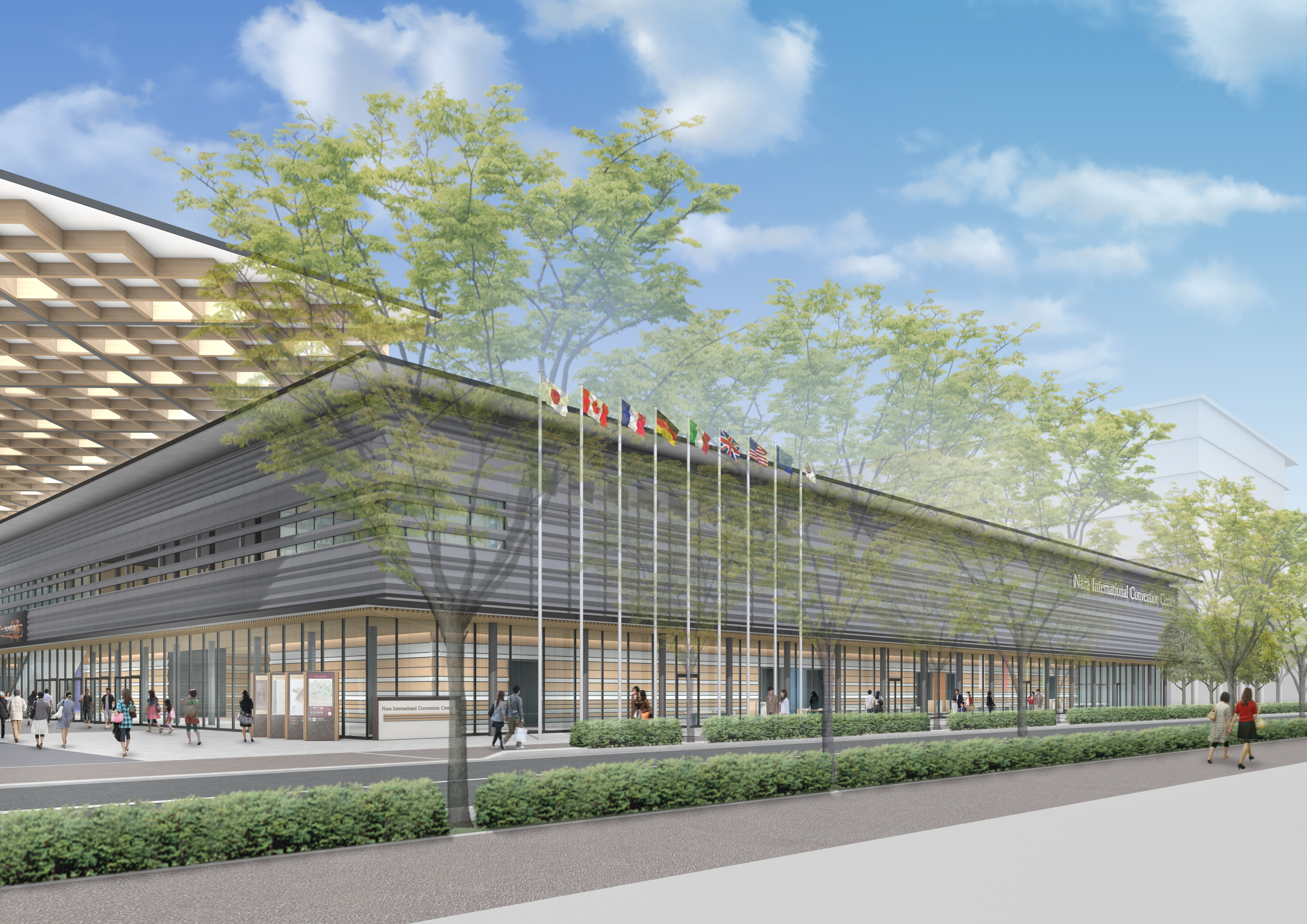 にぎわい施設は、ホテルやNHK奈良放送局を除いた約2・3ヘクタールの敷地に建設。グループの提案では、2千人を収容できる大会議室を備えたコンベンション施設▽屋根付きの多目的広場(約千平方メートル)▽劇場を備える観光振興施設(約5310平方メートル)▽レンタサイクル▽駐車場、バスターミナル―などを計画している。