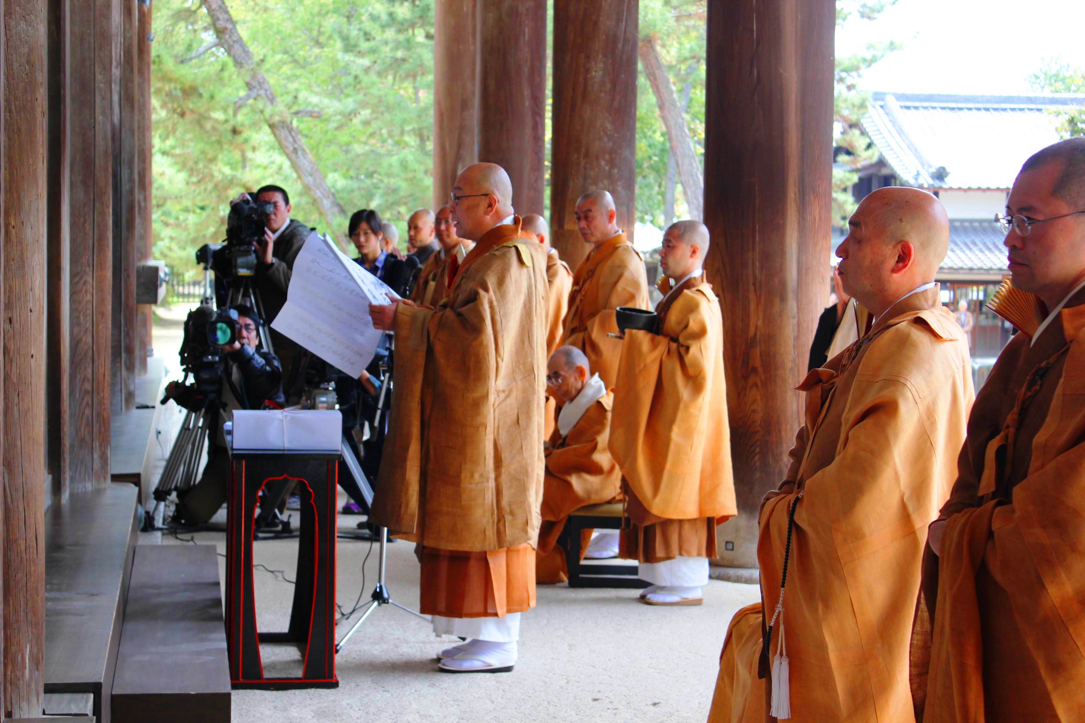 法要には西山師のほか僧侶16人が出仕。西山師は金堂の本尊・盧舎那仏の前で第87世長老だった石田智圓師から、諸堂の鍵が入った箱を引き継いだ。その後、長老として法灯を継承することを伝え、恒久平和や万民の幸福を願う晋山奉告文を読み上げた。