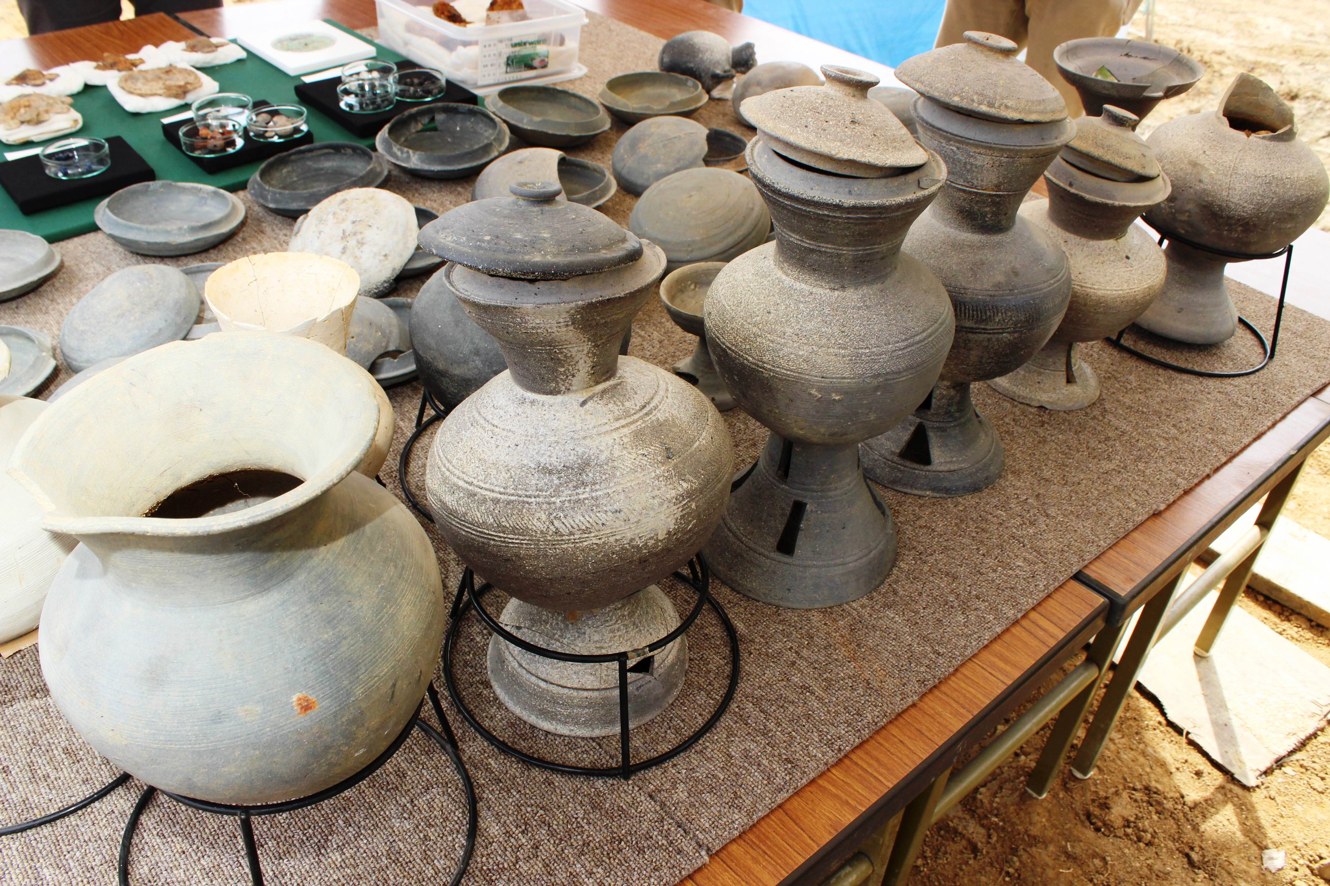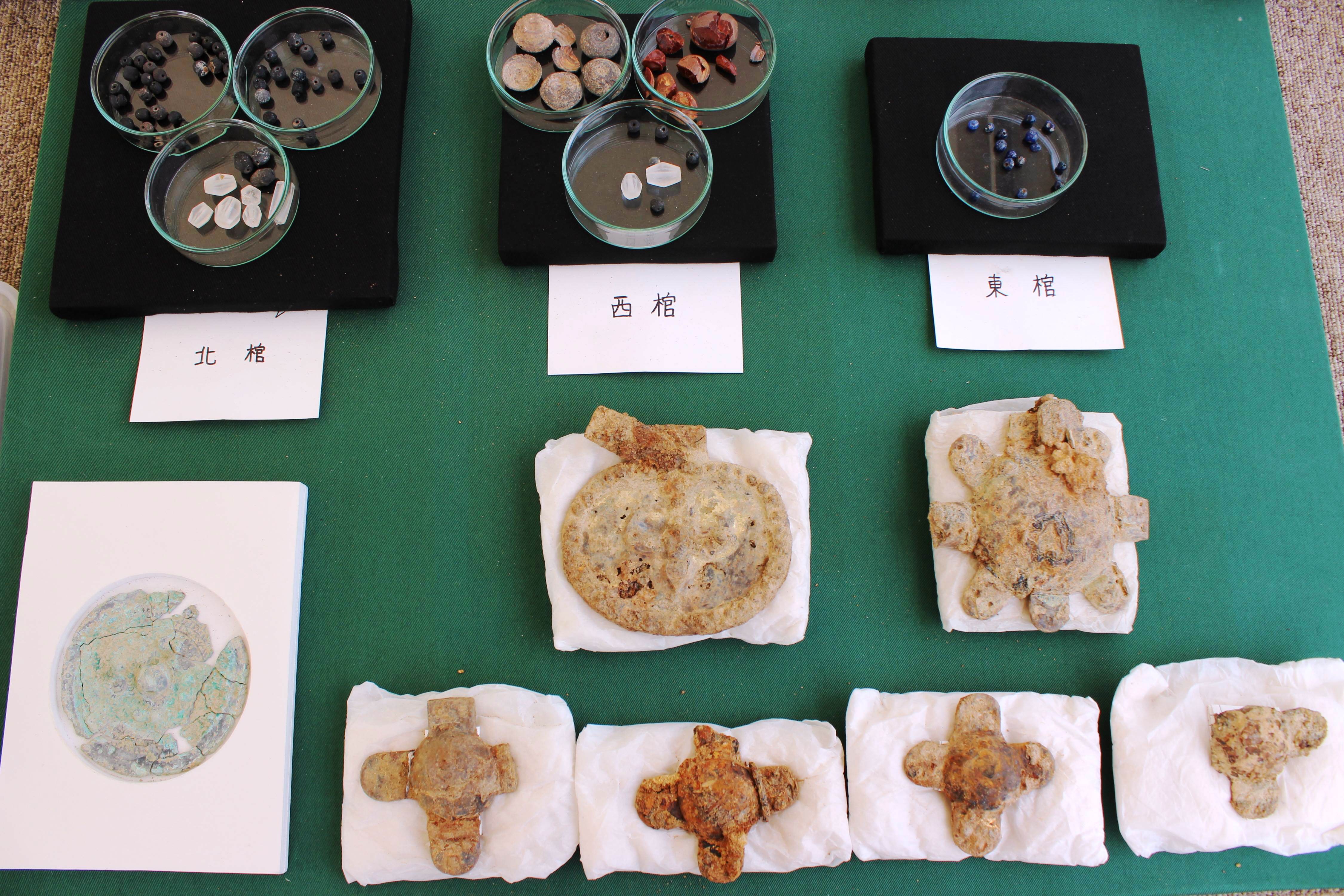 付近からは副葬品の水晶製や琥珀製の玉が出土。50点以上の須恵器や鉄製の馬具、国内製の小型鏡1面(直径9センチ)も見つかったという。