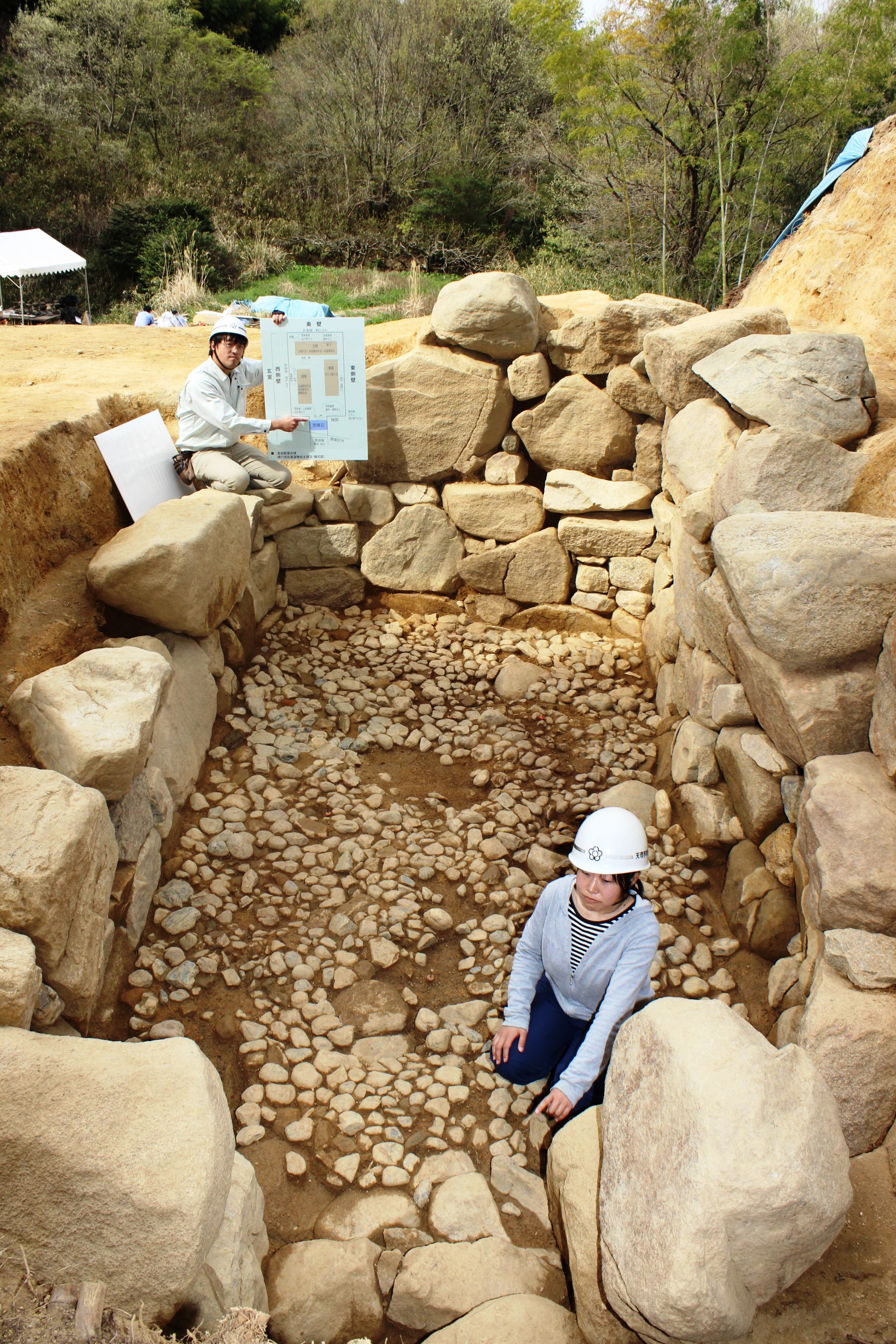 石室は、奥行き約4・4メートル、幅約2・2メートル、高さ約2・2メートル。壁面には1辺30センチ~1メートルの石が7段ほど積まれ、床には3カ所に木材の痕跡があった。少なくとも3基の木棺が安置されていた可能性があるという。