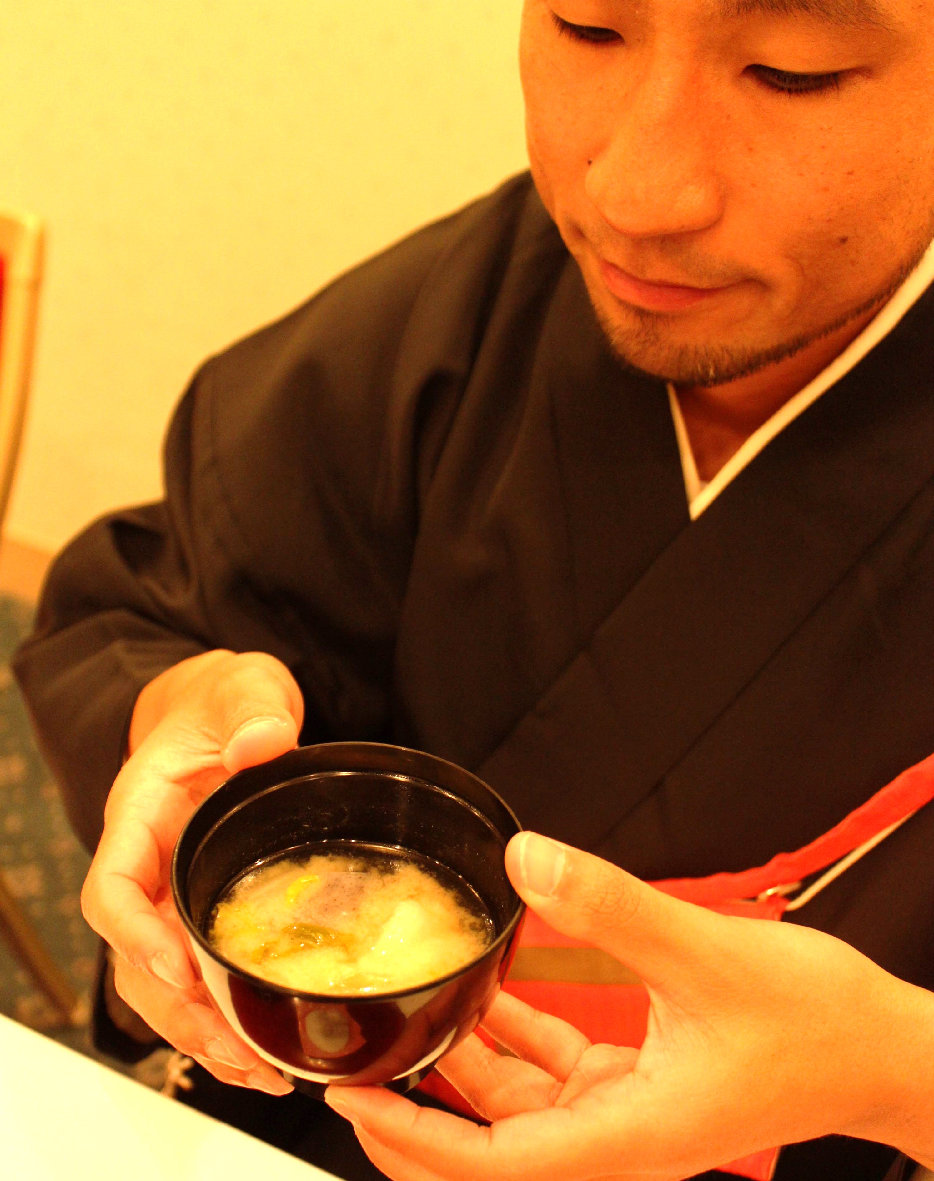 精進汁は昆布のみでだしを取り、厚揚げや白菜、大根、金時人参などが入った具だくさんのみそ汁。野菜の甘みが体に優しくしみわたる。興福寺の辻明俊執事は、「精進汁は1年の無病息災を祈り毎年食べられている伝統の味。料理という視点から寺に関心を持ってもらえるとありがたい」と話していた。