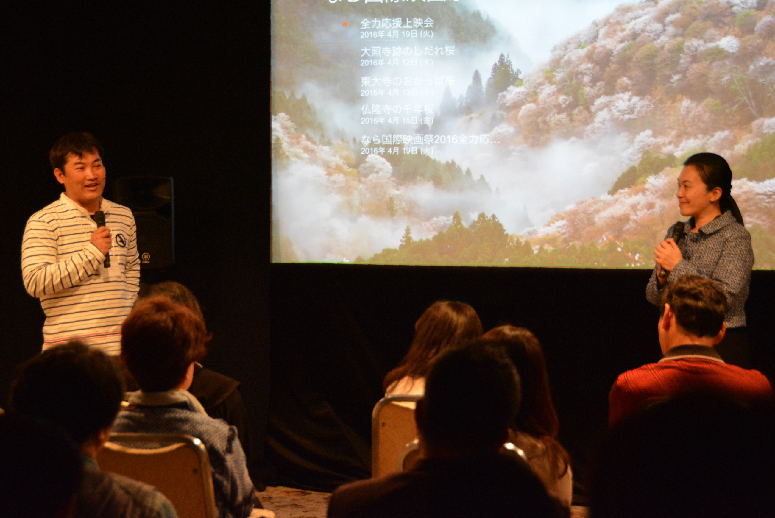 この日は3回の上映会に計約120人が参加。月ケ瀬梅林(奈良市)のウメや藤原宮跡(橿原市)のサクラなどを撮影した作品「梅と桜の大和路」のほか、如意輪寺(吉野町)などで現在も撮影中の映像の一部も公開した。