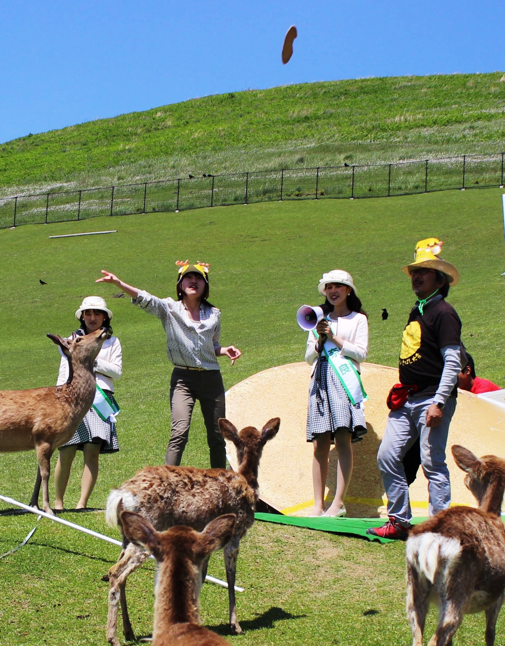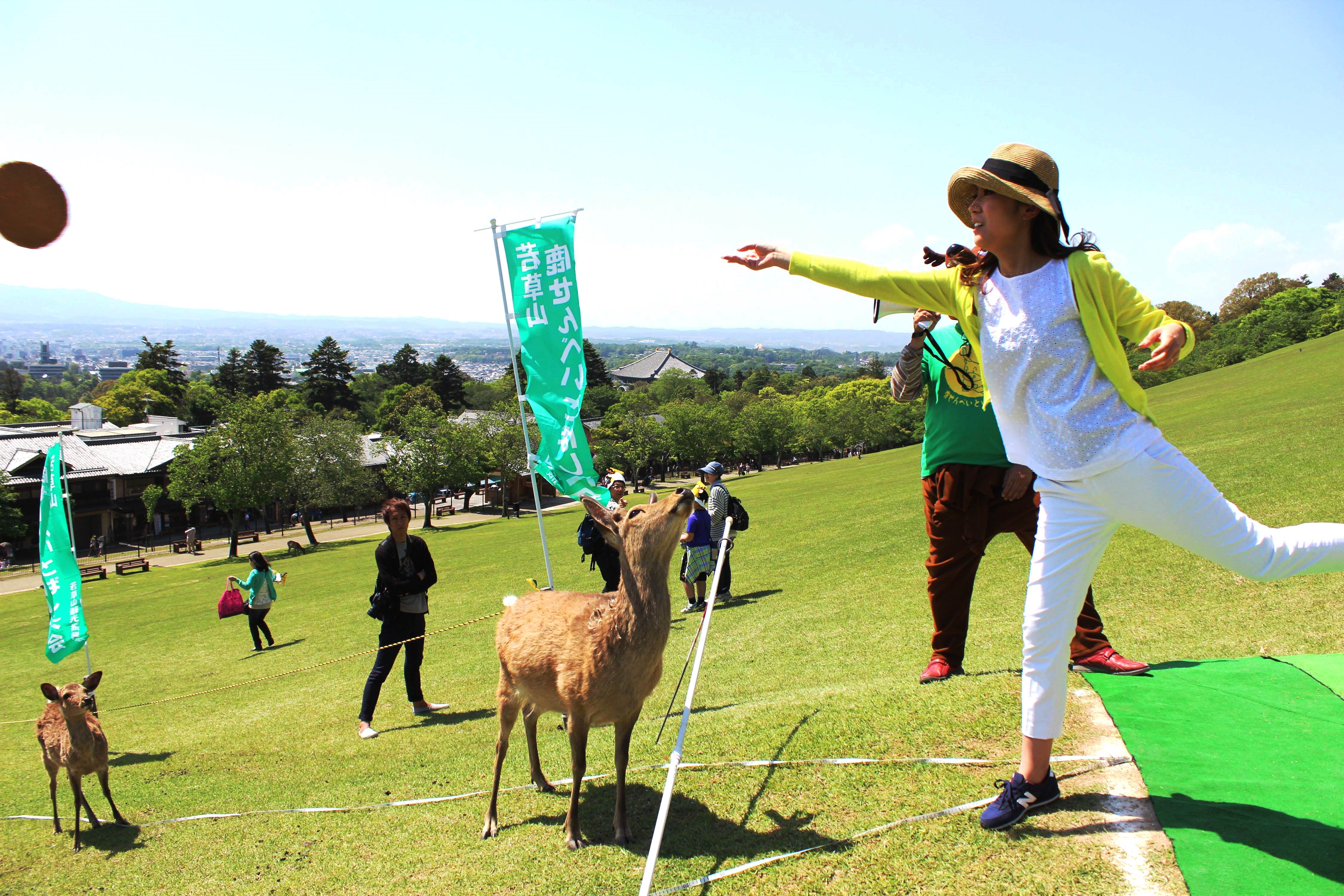 晴天に恵まれたゴールデンウイーク後半の4日、奈良市の奈良公園には家族連れなど県内外から多くの観光客が訪れた。若草山中腹では特大の鹿せんべいを投げて飛距離を競う恒例の「鹿せんべいとばし大会」が開催され、参加者らは吹き付ける強風に苦戦しながらも、シカたちの熱い視線に囲まれながら、空高くせんべいを飛ばした。