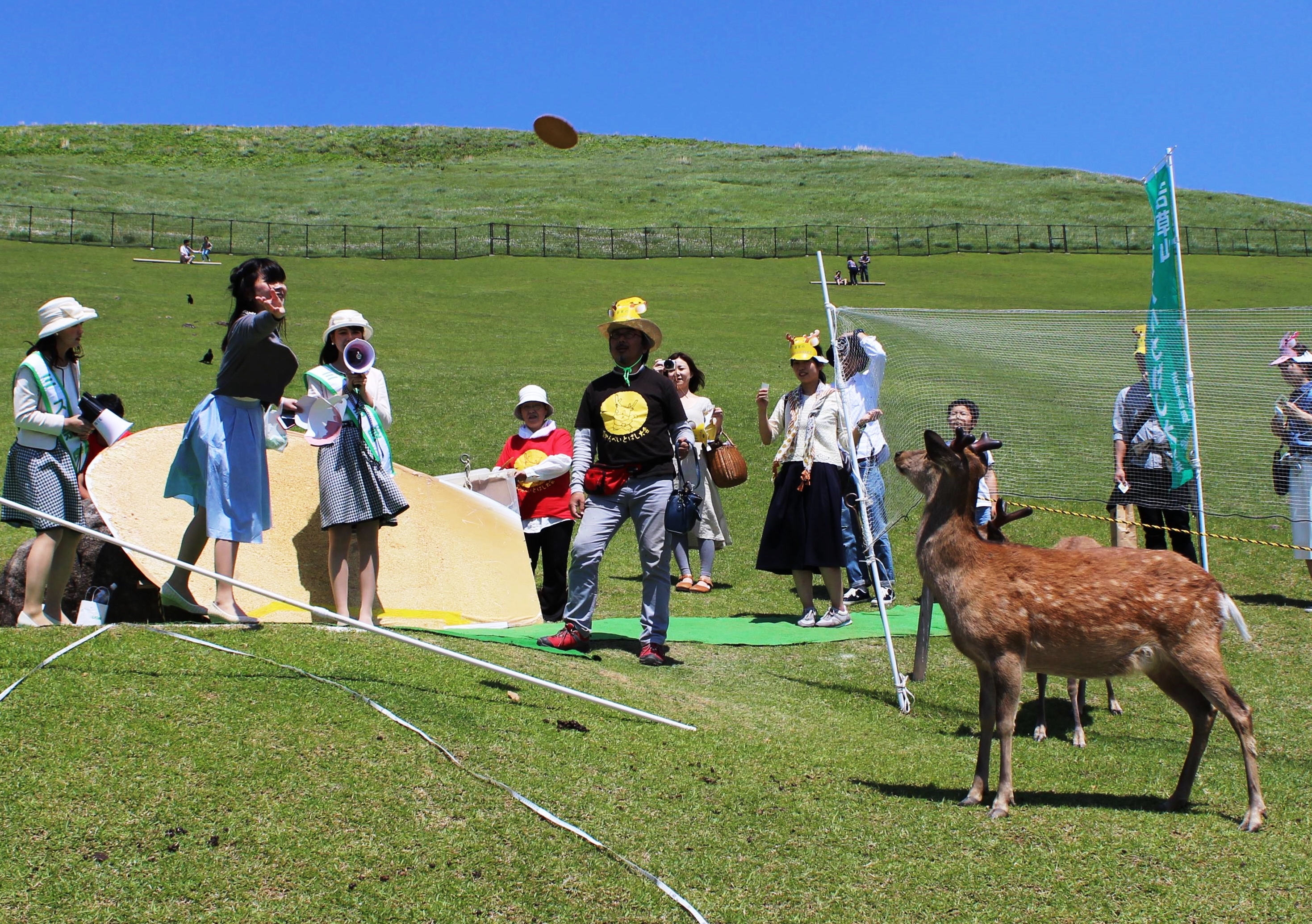 シカの熱視線受け、奈良の若草山で恒例の「鹿せいべいとばし大会」