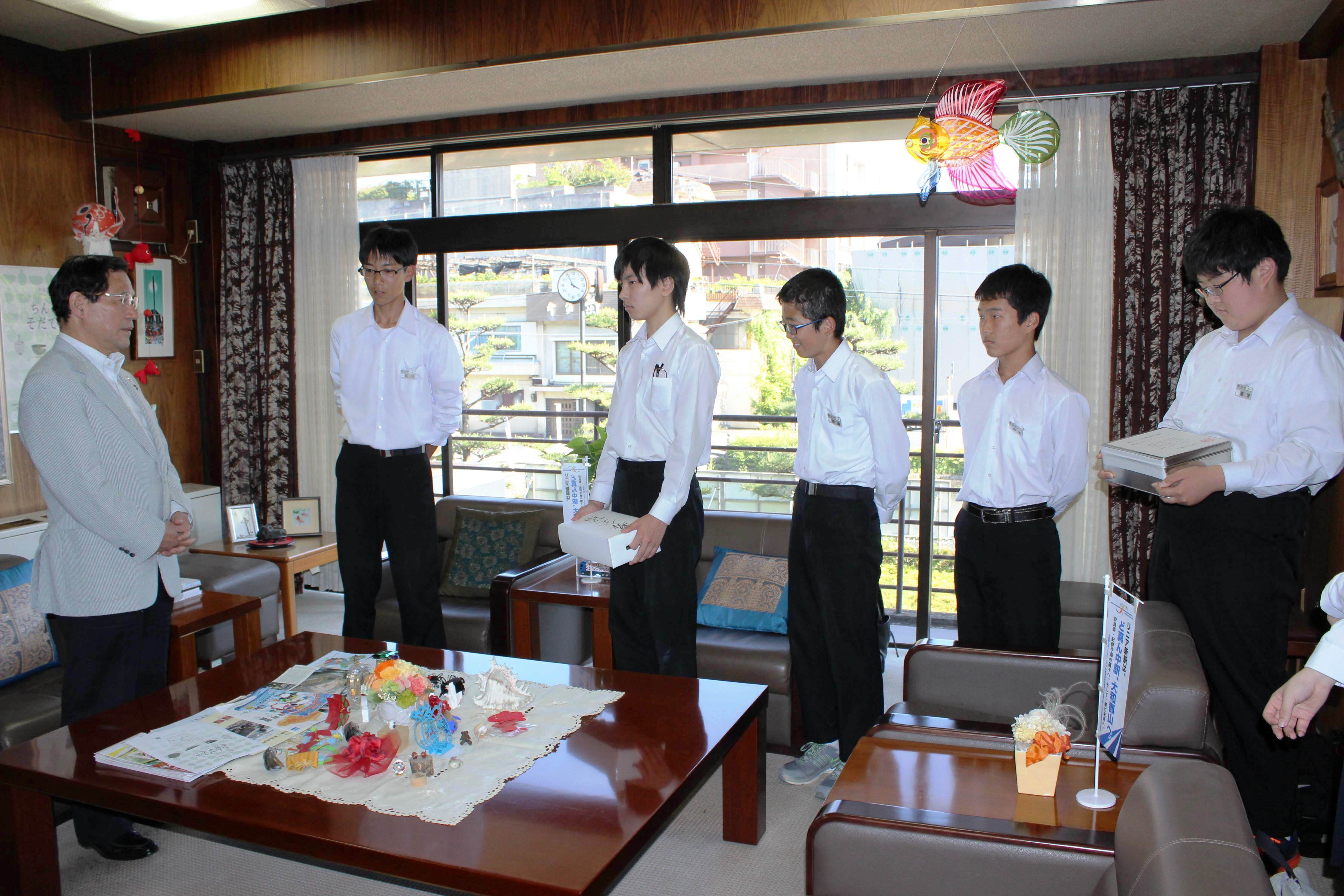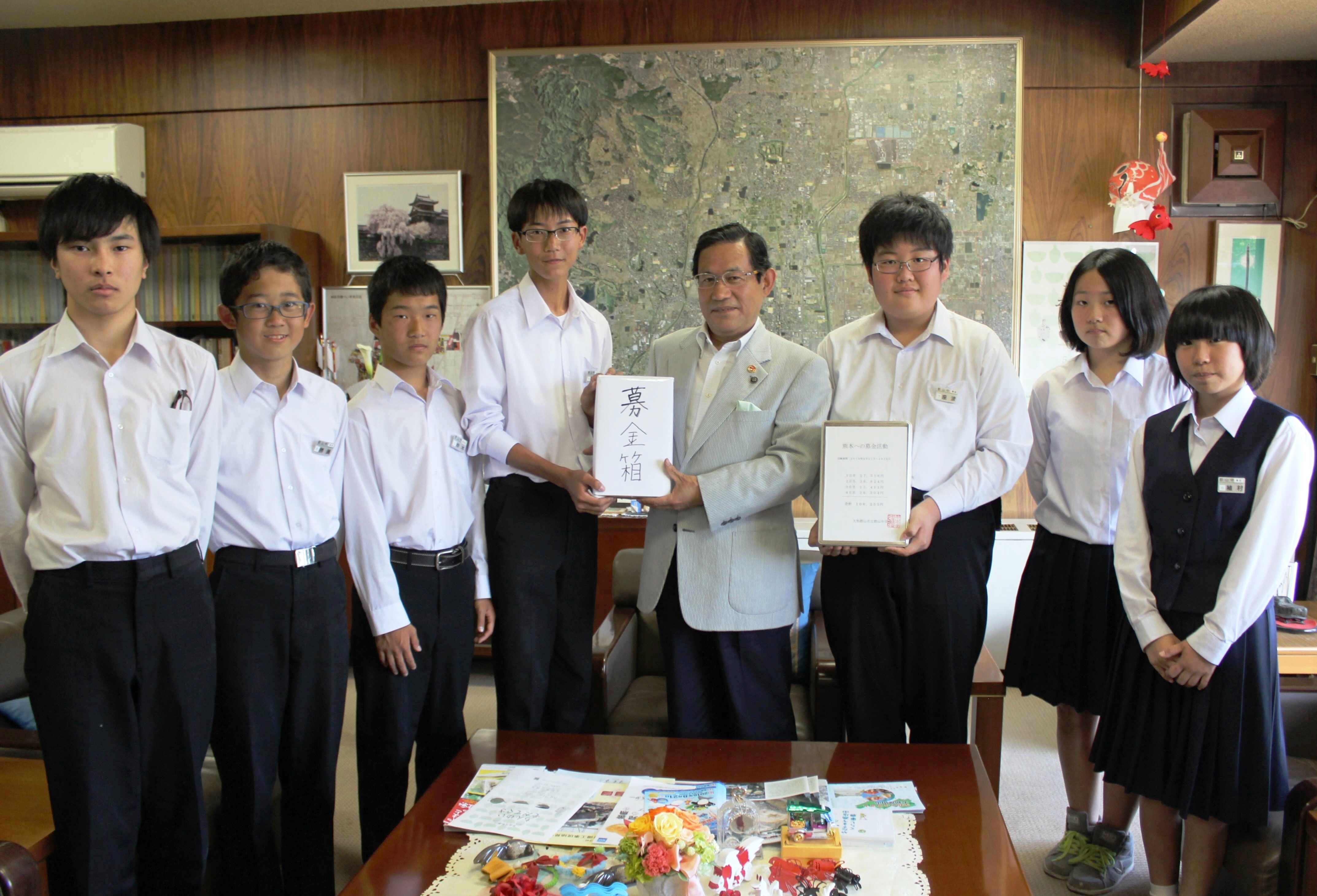 大和郡山市立郡山中学校生徒会のメンバー7人が12日、同市役所を訪れ、熊本地震の被災者支援に集めた義援金10万6255円を上田清市長に届けた。