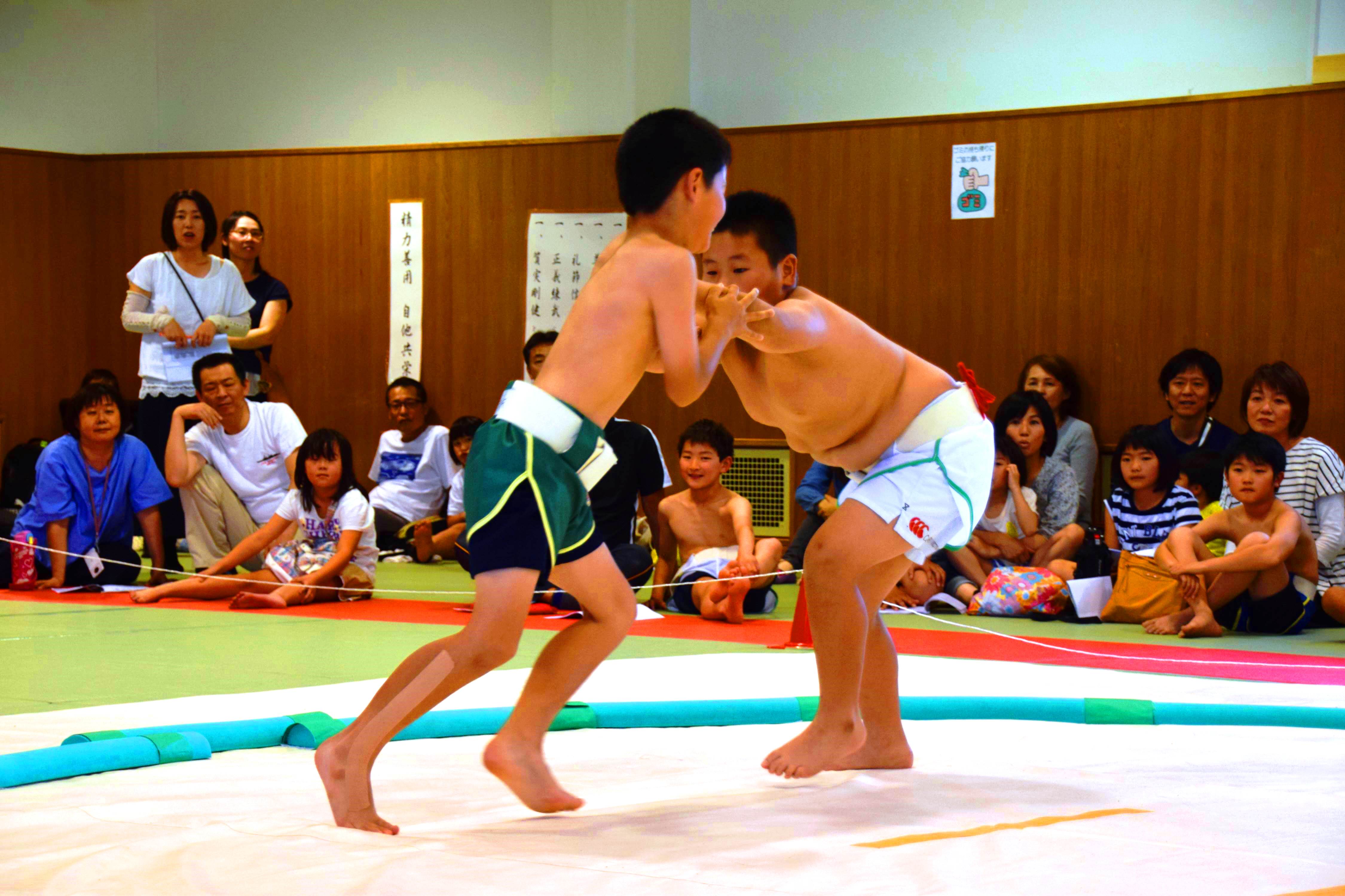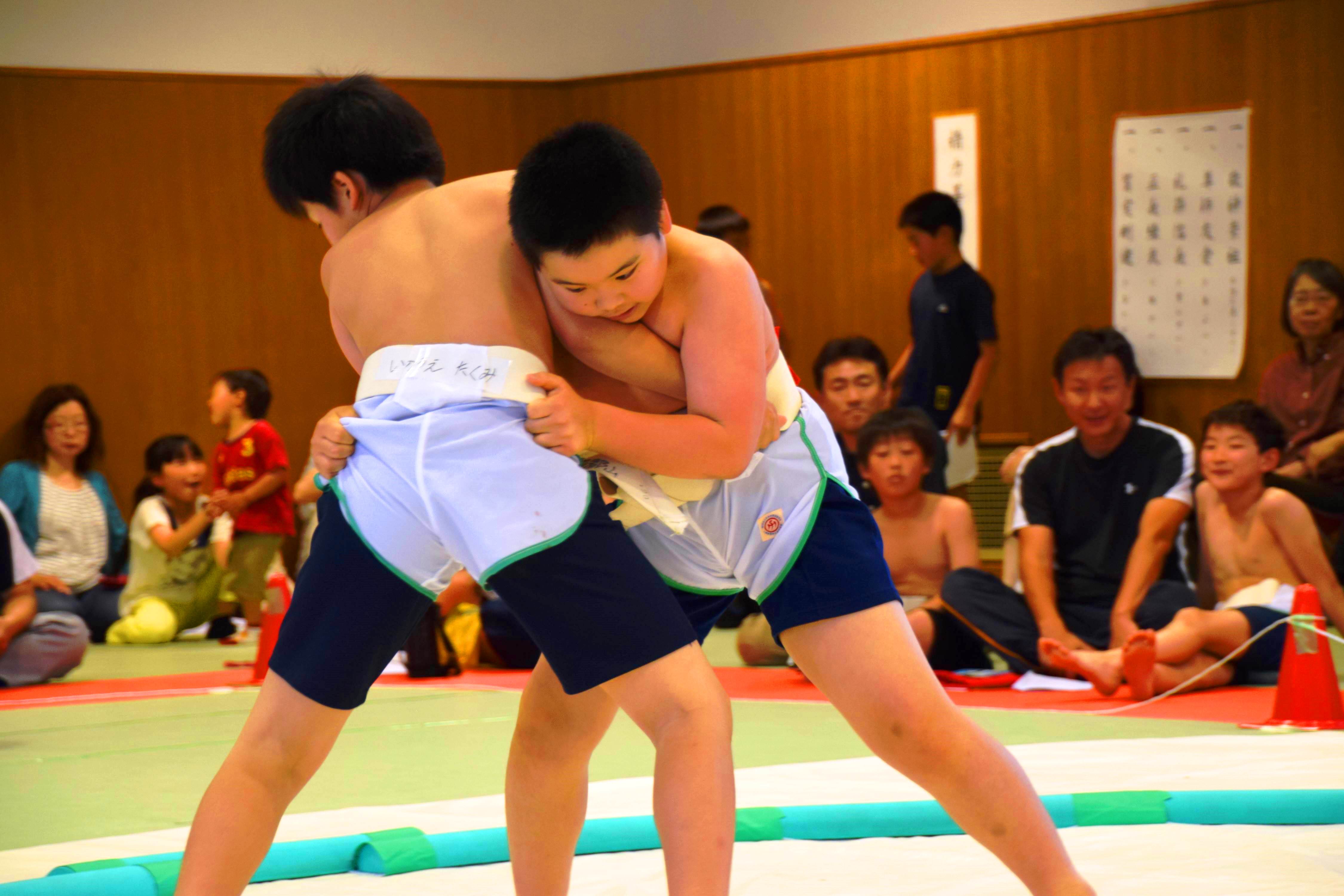 土俵上で「ハッケヨイ」のかけ声とともに元気いっぱいに真剣な取り組みをみせた〝小さな力士〟たち。時折飛び出す豪快な投げ技に、観客からは歓声があがっていた。