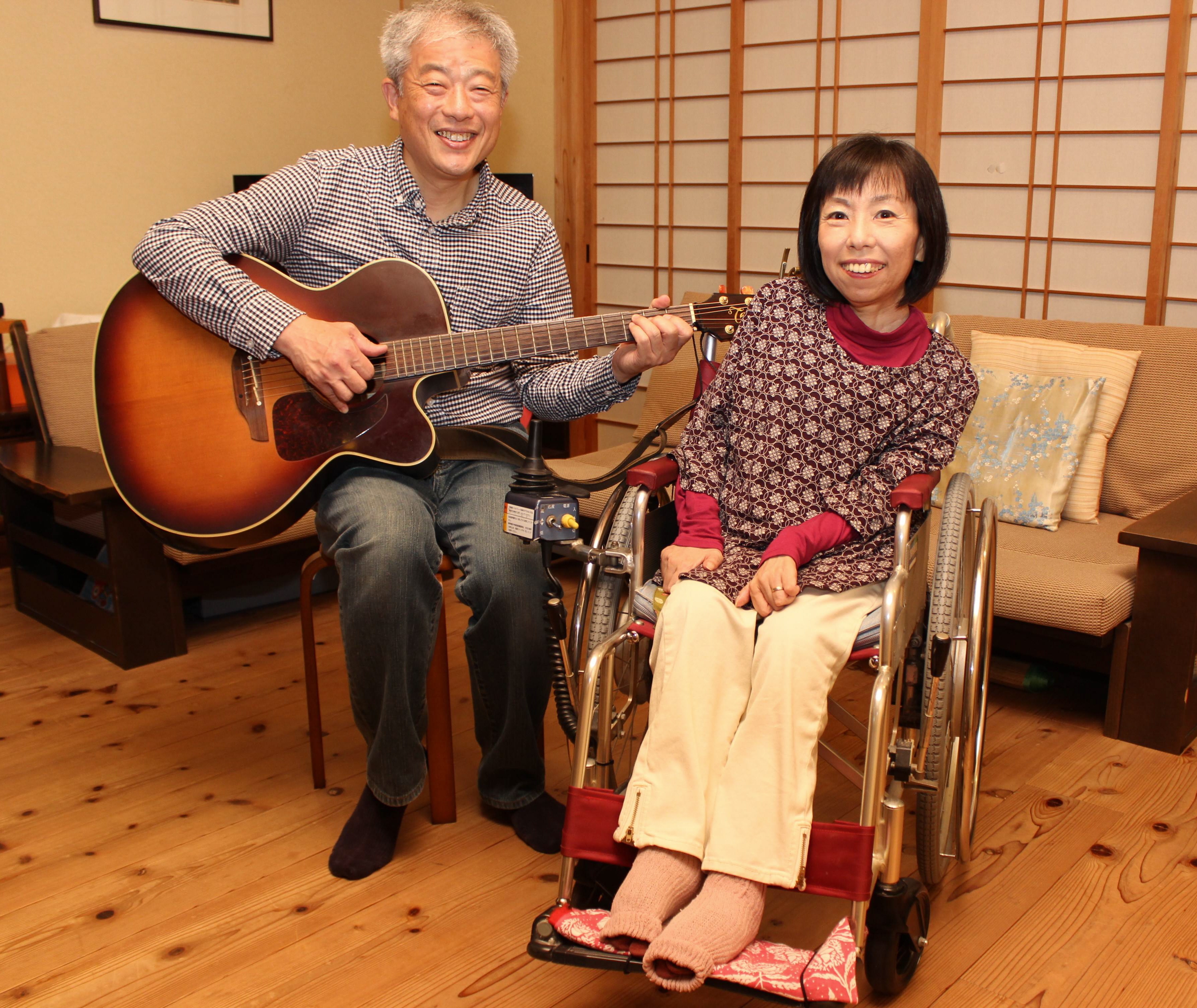 夫の真治さんと出会ったのは24歳のとき。当時、京都大3年だった真治さんが、友人に誘われて病棟の合唱コンサートに訪れたのがきっかけだ。患者の外出介助ボランティアとして病棟に通ううち、互いにひかれ合って交際を開始。「中途半端な付き合いはしたくない」(真治さん)と自身の両親を説得、交際6年目に結婚した。
