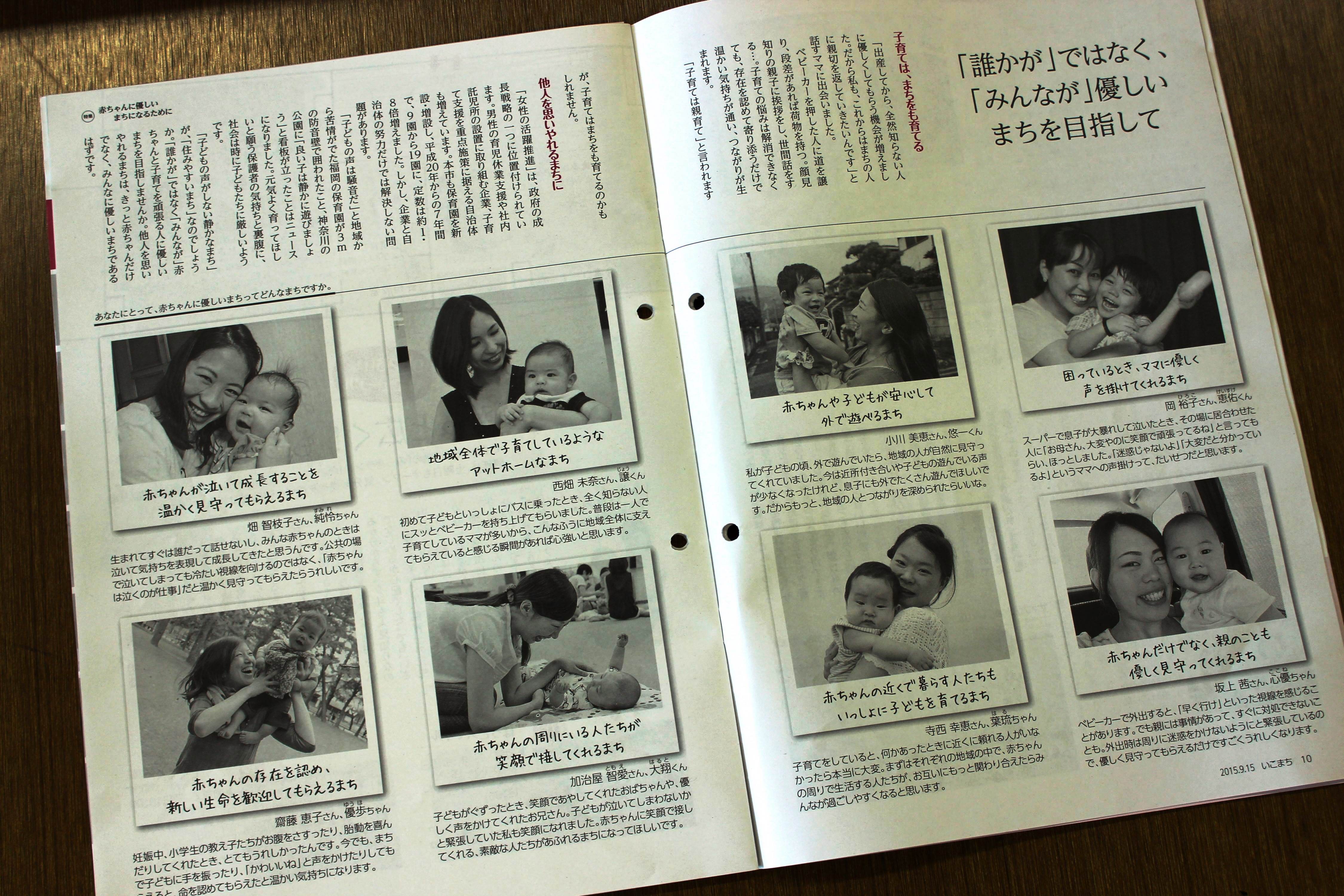 市内で乳児を育てる女性の2人に1人が専業主婦、男性の2人に1人が午後9時以降に帰宅する―という市の現状を受け、子育て中の母親ら30人を取材。「子供が泣くとにらまれる」「ベビーカーを押す隣を車が猛スピードで通り過ぎる」―など、母親たちの悩みを取り上げたほか、親子が笑顔で触れ合う写真も多数掲載。「行政や企業の努力だけでは子育てに優しいまちは実現しない。みんなで他人を思いやれるまちにしよう」と提起した。