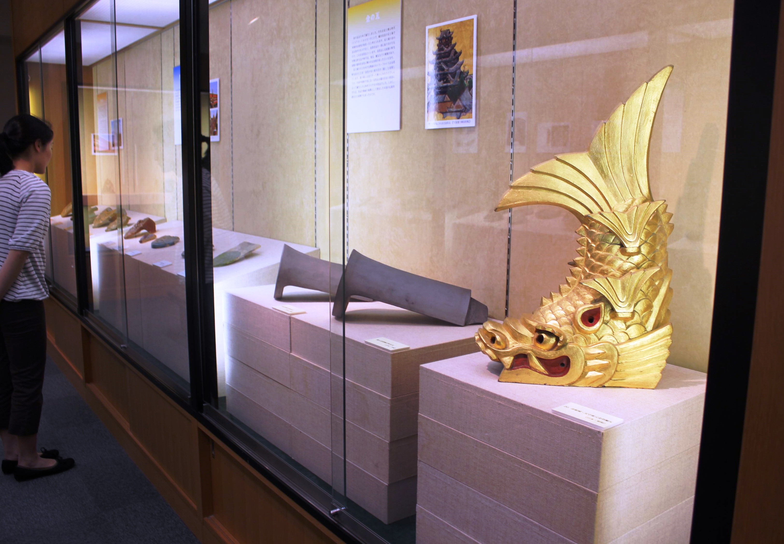 緑や黄、金の瓦に分けるなどして約50点を紹介。緑の瓦は平安時代の緑釉均整唐草文軒平瓦や緑釉丸瓦など、黄の瓦では中国の明、清朝時代の黄釉龍文軒丸瓦などがある。金箔の瓦は日本で安土桃山時代に生まれたといい、会場では試作復元された彦根城天守の金箔鯱瓦(大きさは実物の3分の1)などを展示。清水昭博館長は「瓦は地味なイメージだが、カラフルなものもあり、調べると歴史もある」と話す。