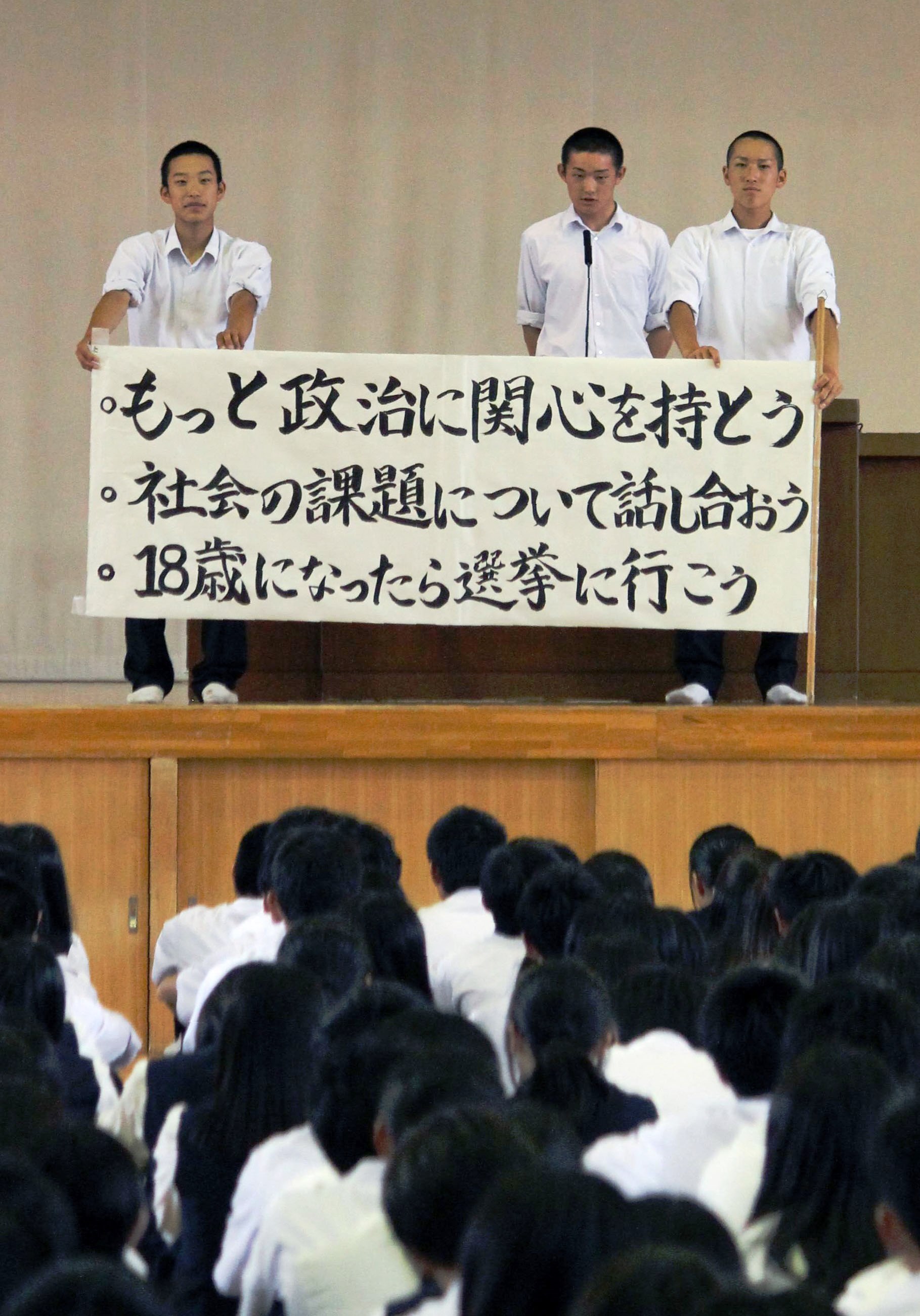 この日は選挙管理委員長の3年、串領馬さん(17)らが体育館の舞台に立ち、「選挙に行こう」など3つのスローガンを書いた横断幕を掲げて「私たちの意見を一票という形で自ら示しましょう」などと呼びかけた。