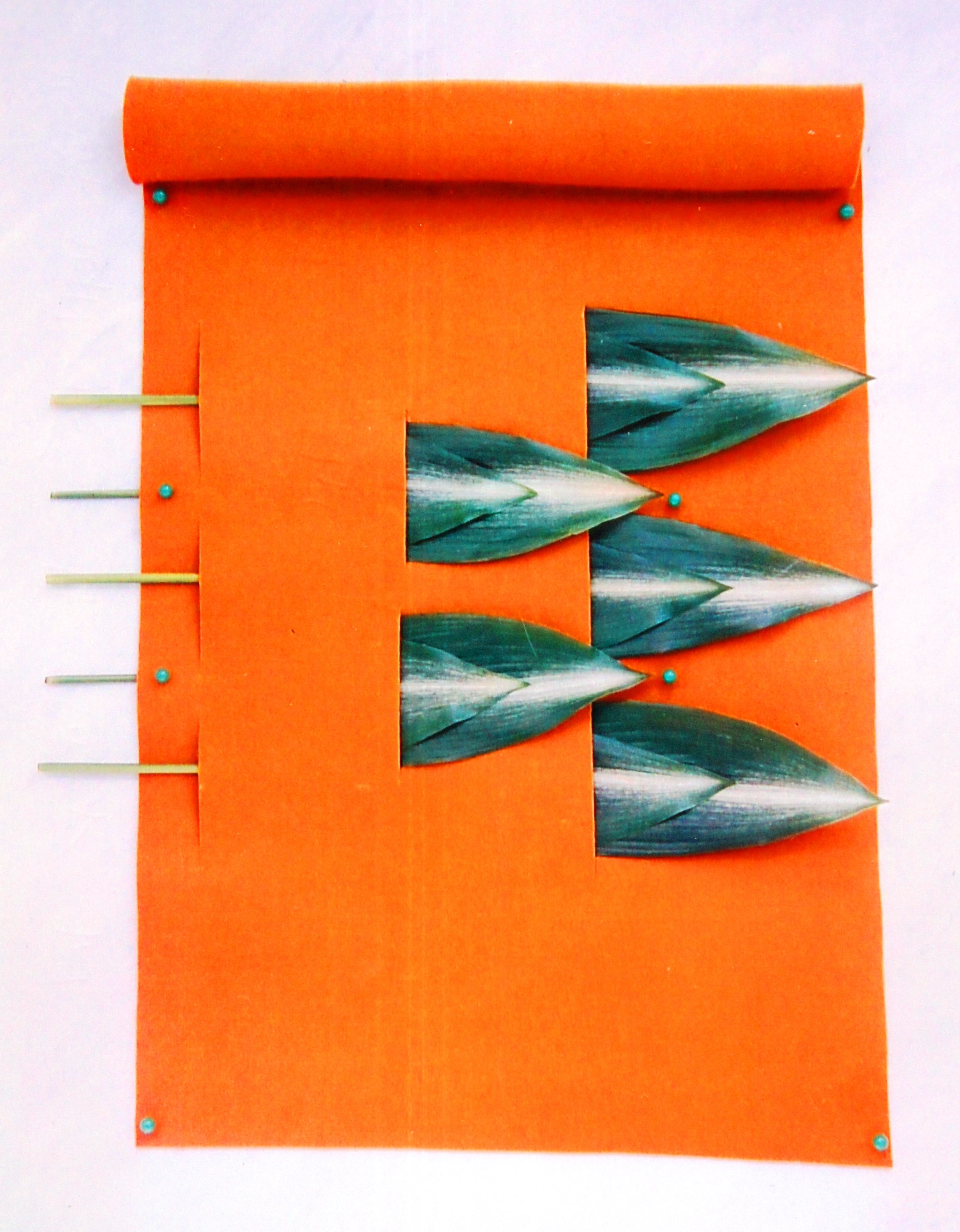 厚みのあるフェルト地に鋏で切り込みを入れ、裏から表へ旭葉蘭の葉と茎を同じ角度、同じ方向へと並べてみました。この夏も穏やかな風に恵まれ無事に過ごせますように。