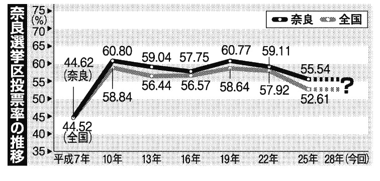こうした全国的な〝政治離れ〟が進む中、投票環境を改善しようと10年6月、投票時間の2時間延長や不在者投票の理由の緩和などが定められた改正公職選挙法が施行。施行後初の選挙となった同年の参院選では、奈良選挙区で60・80%、全国で58・84%と大幅に上昇し、その後は50~60%台で推移している。
